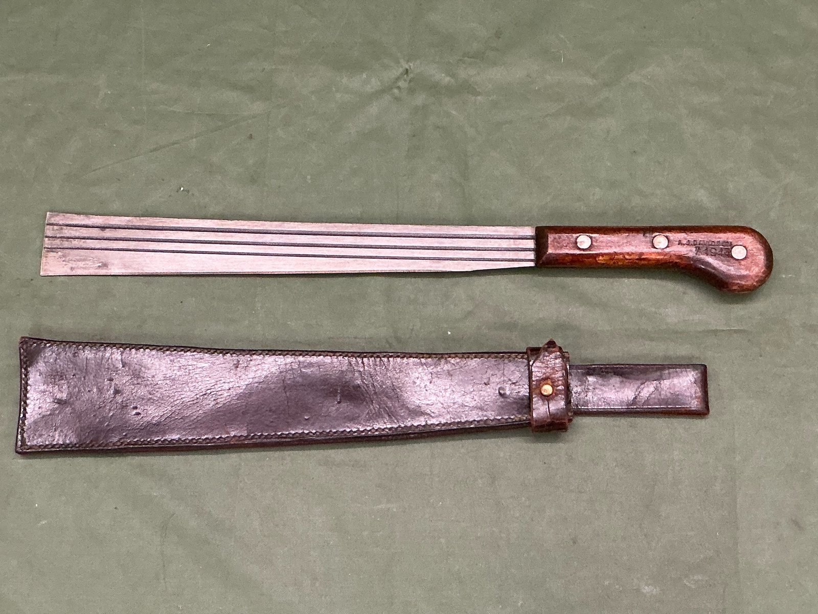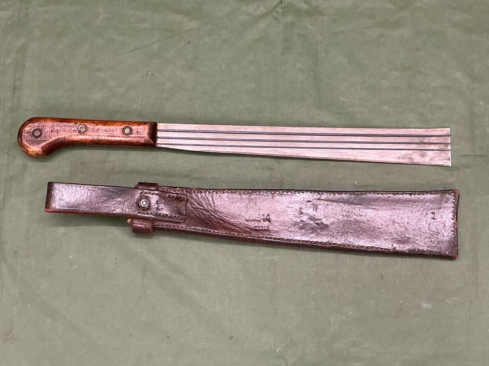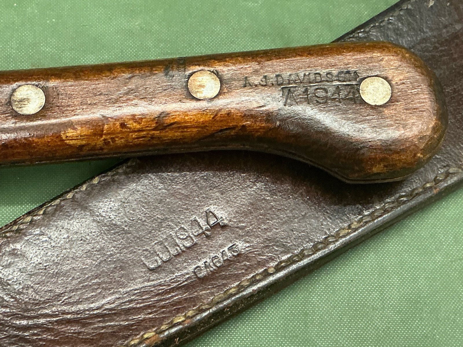 a World War II Chindit bamboo machete, the wooden handle maker marked AJ Davidson and dated 1944 the reverse of the leather scabbard is also dated 1944 and the securing tab and stitching are all intact.