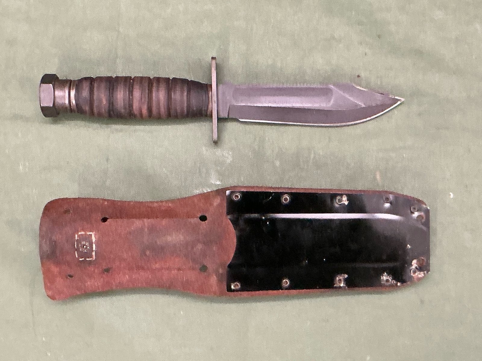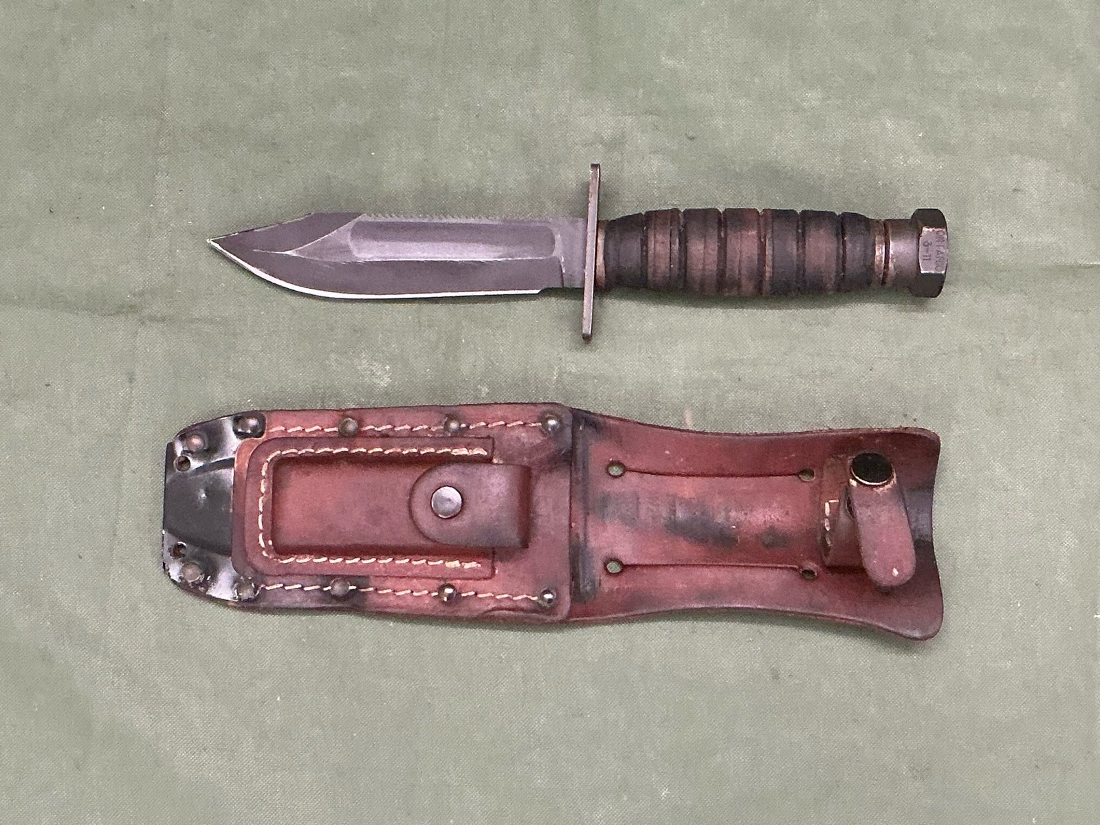 A NICE EXAMPLE OF THE AMERICAN AIRCREW KNIFE BLADE HAS FULLER AND SAWBACK TO TOP EDGE LEATHER BOUND GRIPS THE POMMEL IS DATED 3-11 AND MADE BY ONTARIO COMPLETE WITH METAL BACKED LEATHER SCABBARD WITH SHARPENING STONE