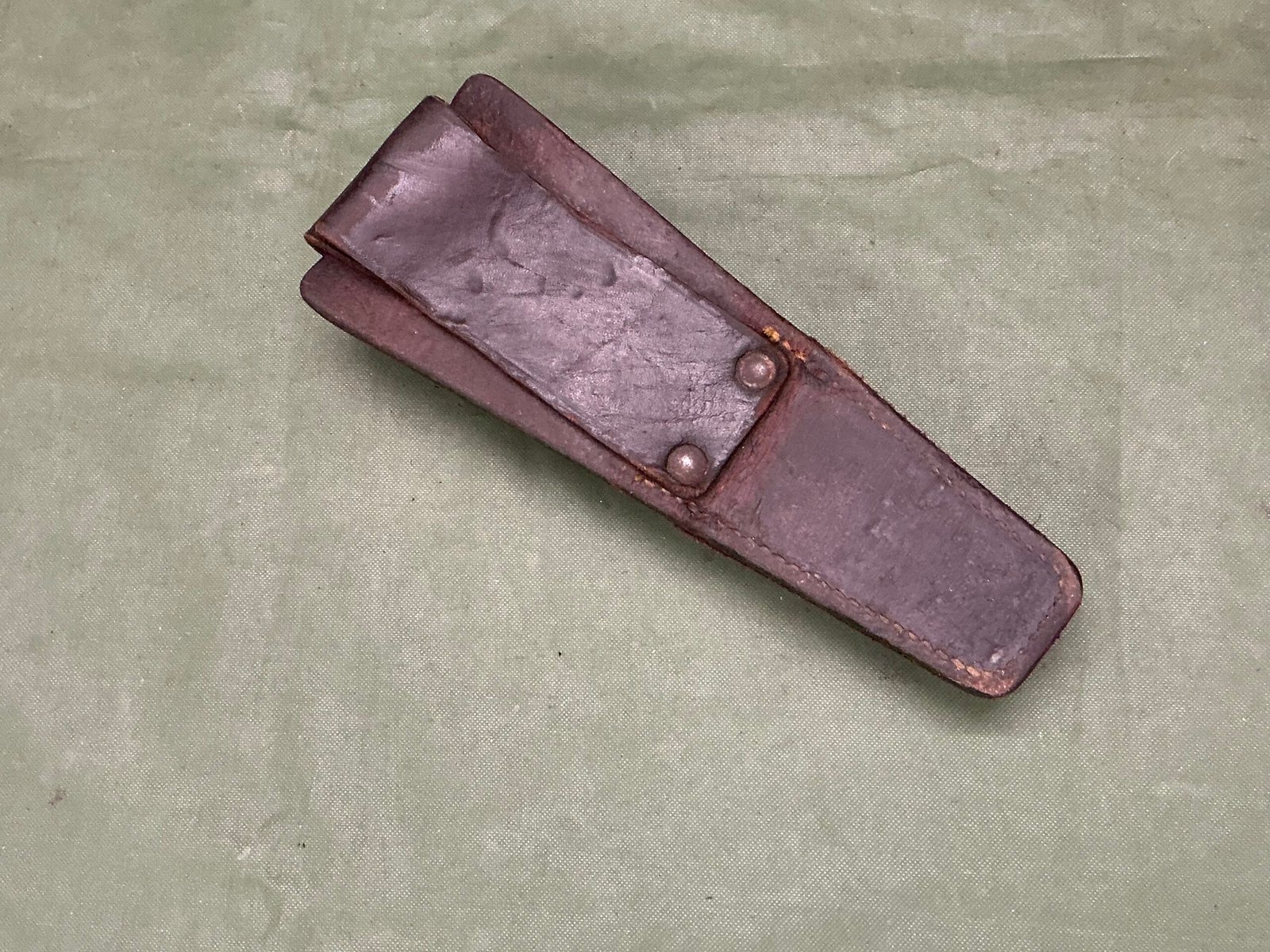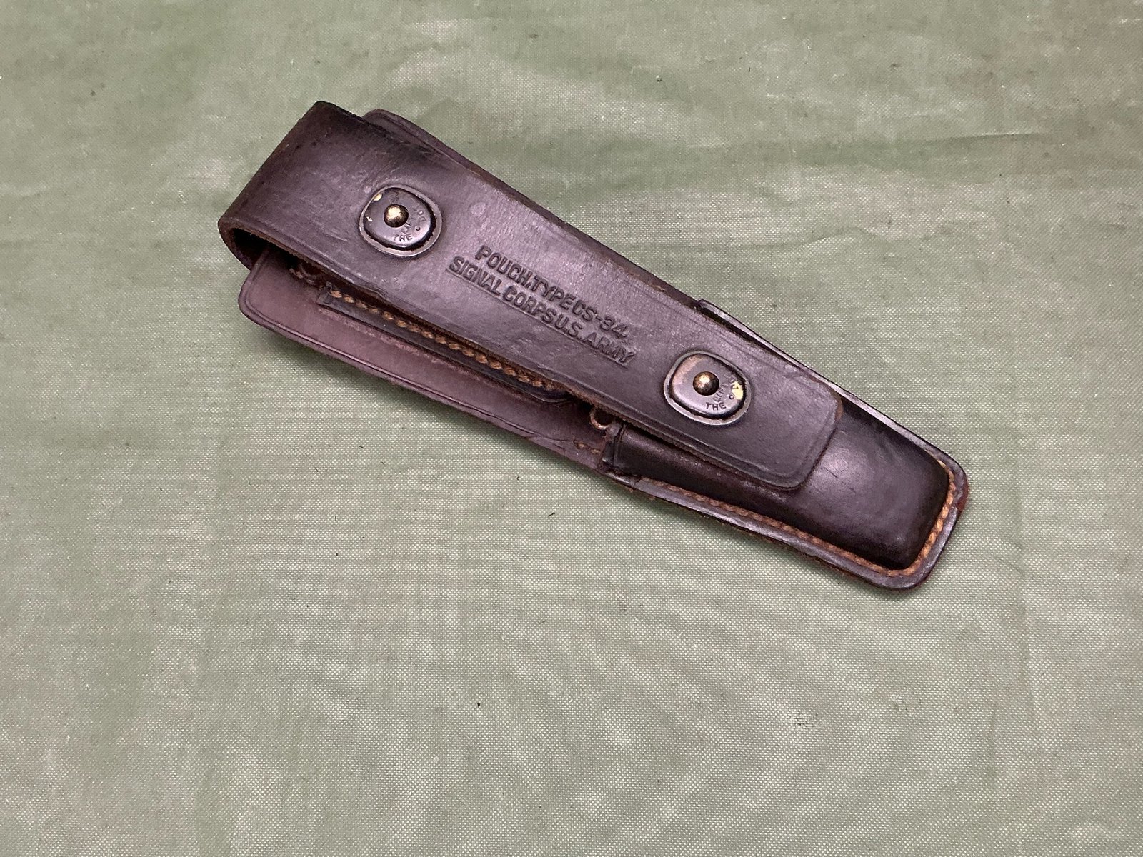 American CS34 pouch known as a linesman’s pouch would hold a small folding knife and pliers ,leather nice and supple, fasteners marked’ lift the dot’ and impressed into the leather stamped ‘POUCH,TYPE CS-34 SIGNAL CORPS U.S. ARMY’ all stitching and rivets intact.