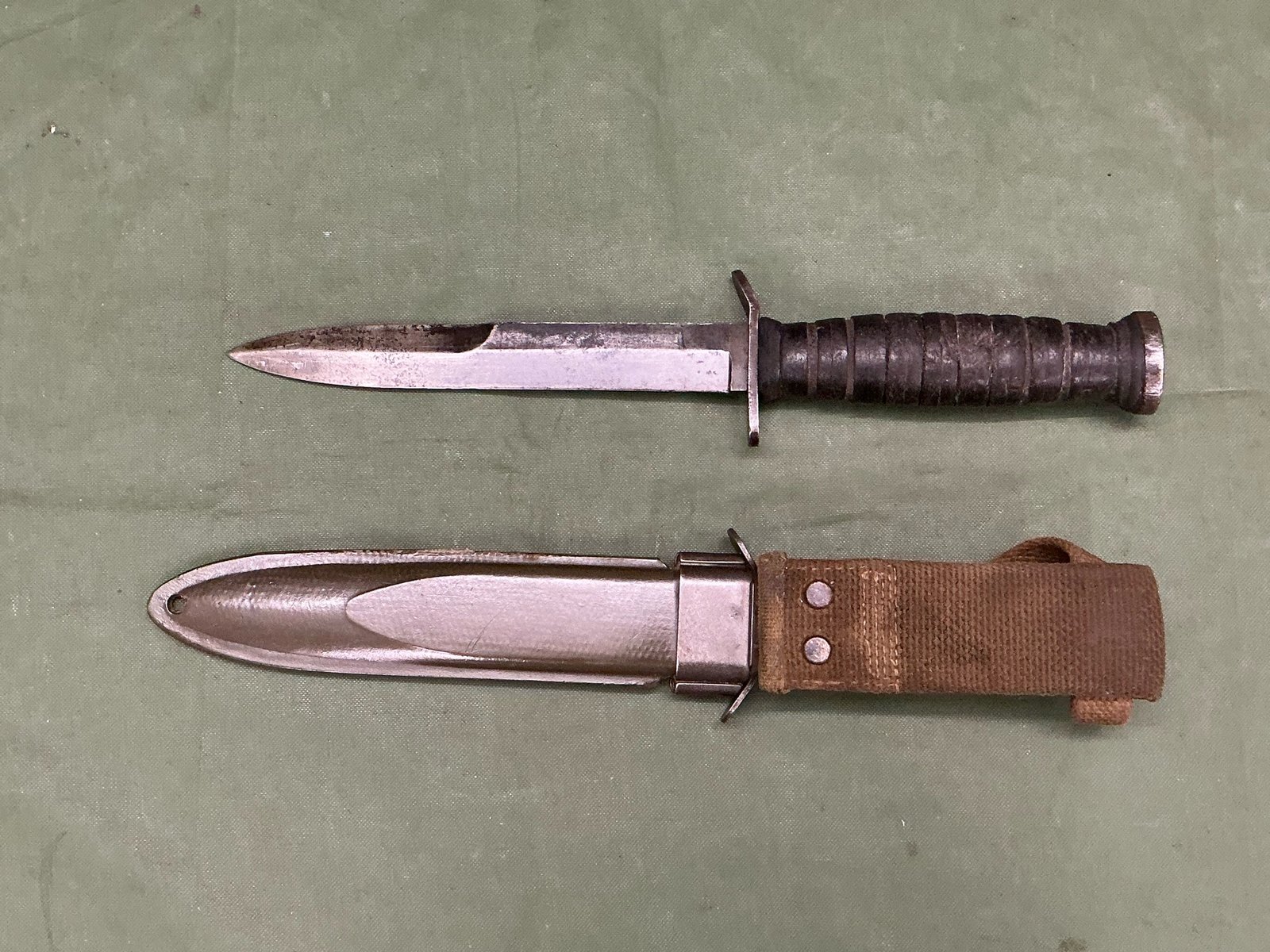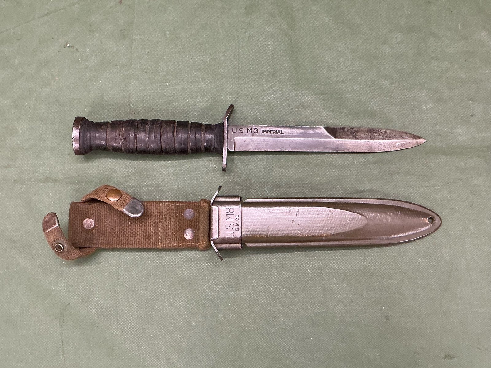 American M3 fighting knife with leather bound grip ,this example is early blade marked by IMPERIAL in its correct early M8 scabbard without pistol belt attachment. This item is over 18s only please click and buy then send photo ID via text or email.