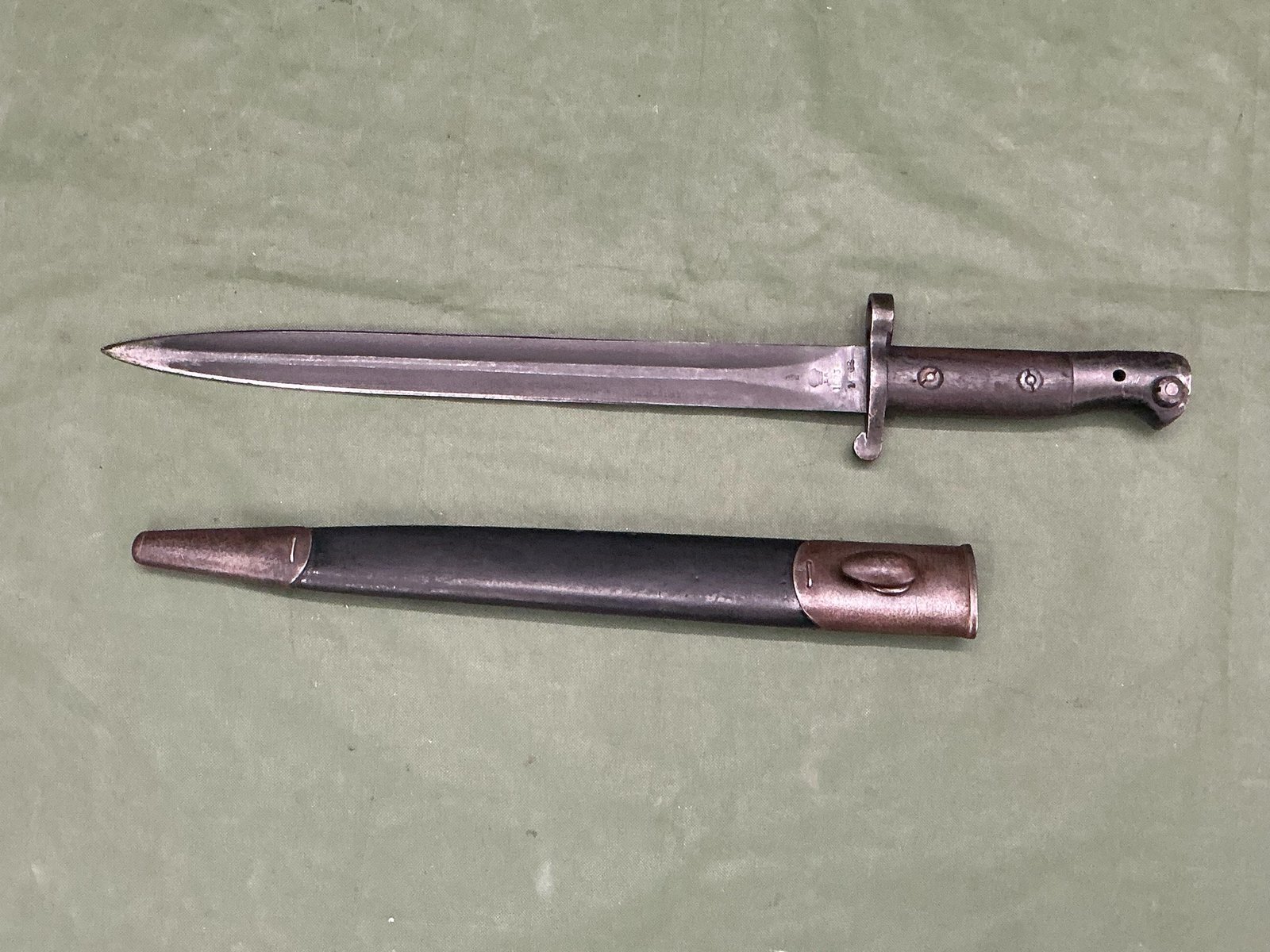 British 1903 pattern Enfield bayonet dated Jan 1908 with scarce Edward Crown to the ricasso and Enfield made, nice two piece wooden grips complete with correct leather scabbard.