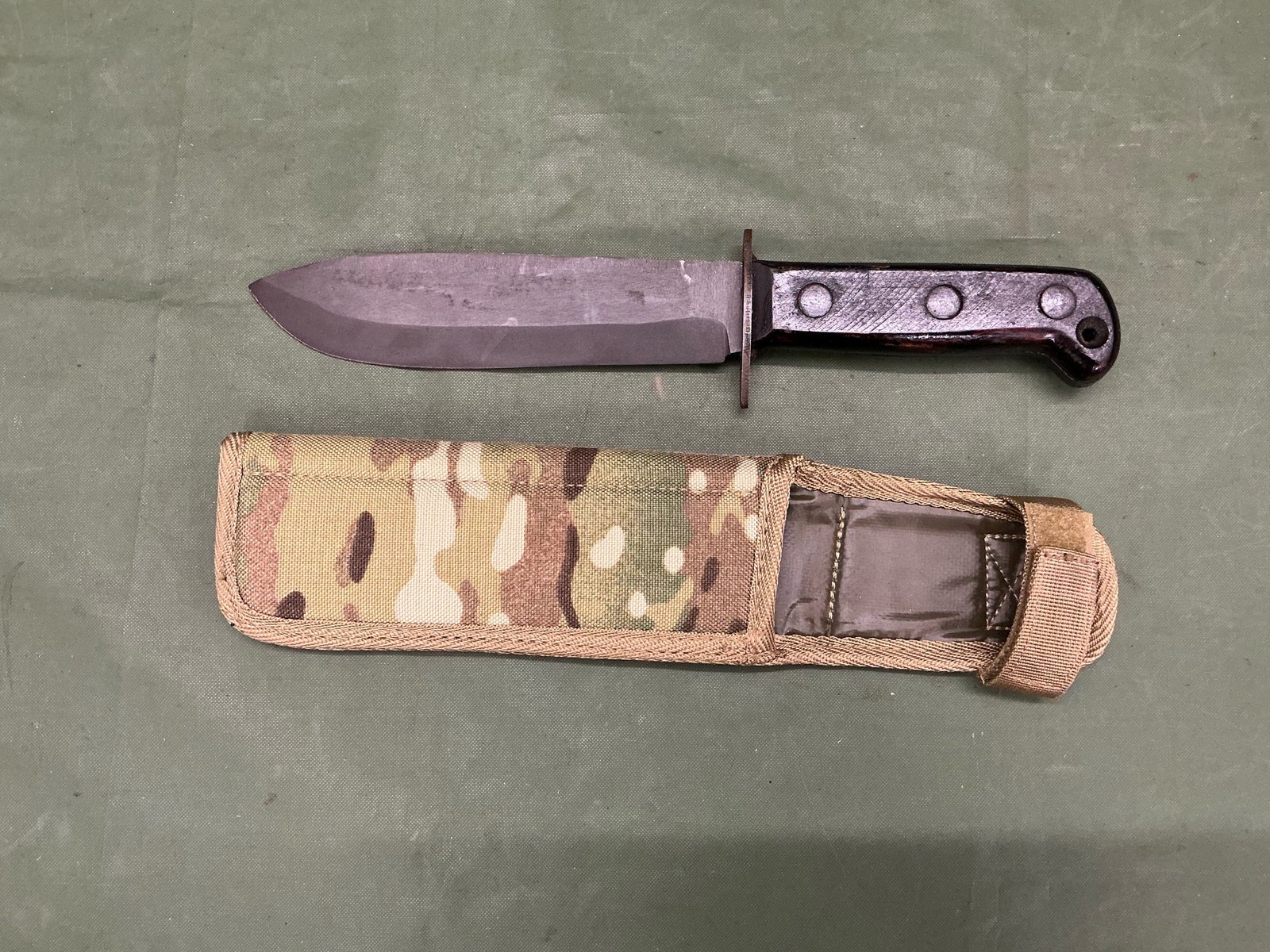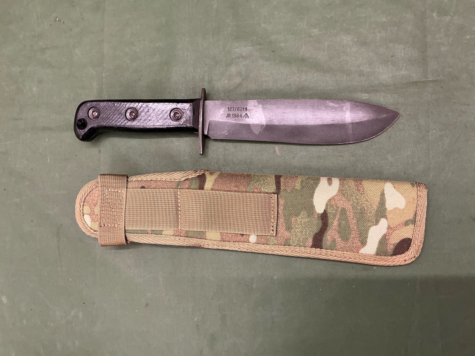 A British Ministry of defence type D survival knife with Babinga hardwood grips coded on the right side of the blade 127/8214JR 1984 with a broad arrow, complete in its MTP canvas type scabbard.