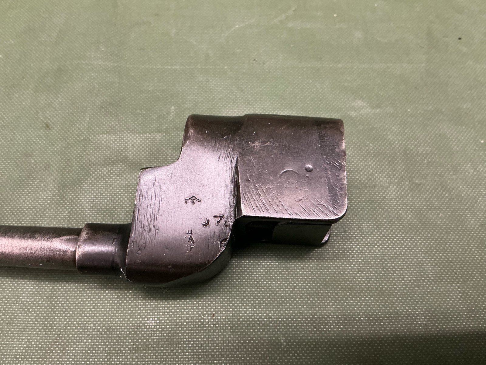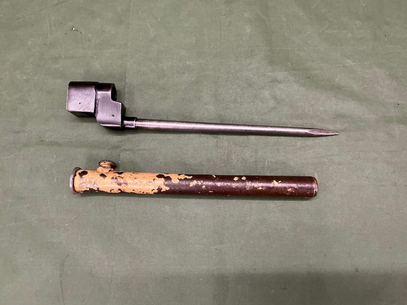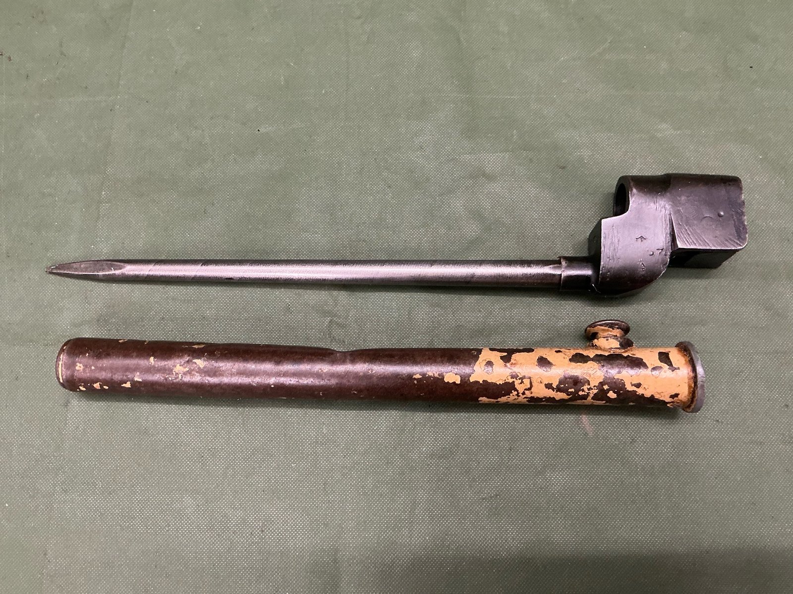 A British made NO4 MK2 bayonet for the Lee Enfield NO4 rifle, with broadarrow and inspector marks,complete with steel scabbard with remnants of sand desert coloured paint.