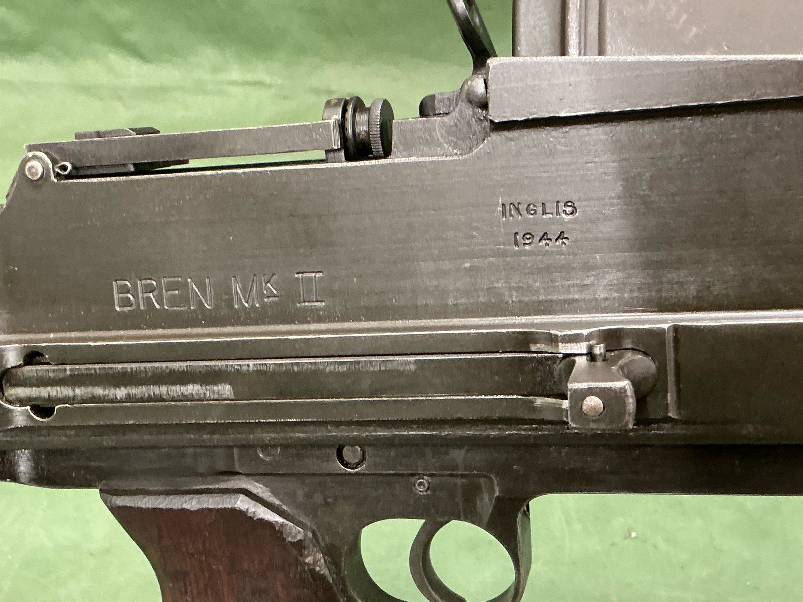 Deactivated World War II Bren MK2 made by Canadian factory of Inglis and dated 1944 also has a 1944 dated barrel,and 44 dated Canadian army issue stamp,this example cocks, strips and dry fires comes complete with GB deactivation certificate dated 2006.