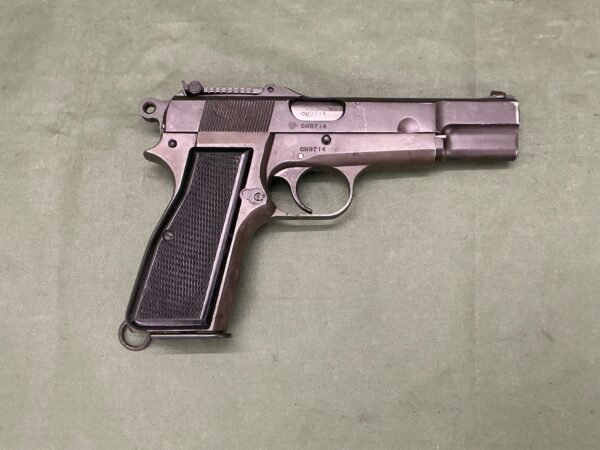 Deactivated World War II Browning high power pistol made it the Inglis factory in Canada, has matching numbers to barrel , slide and frame, has correct plastic intact grips adjustable sight, cocks,strips and dry fires,comes complete with GB deactivation certificate dated 2026 this is a reissue certificate as the pistol was originally deactivated in 2007.