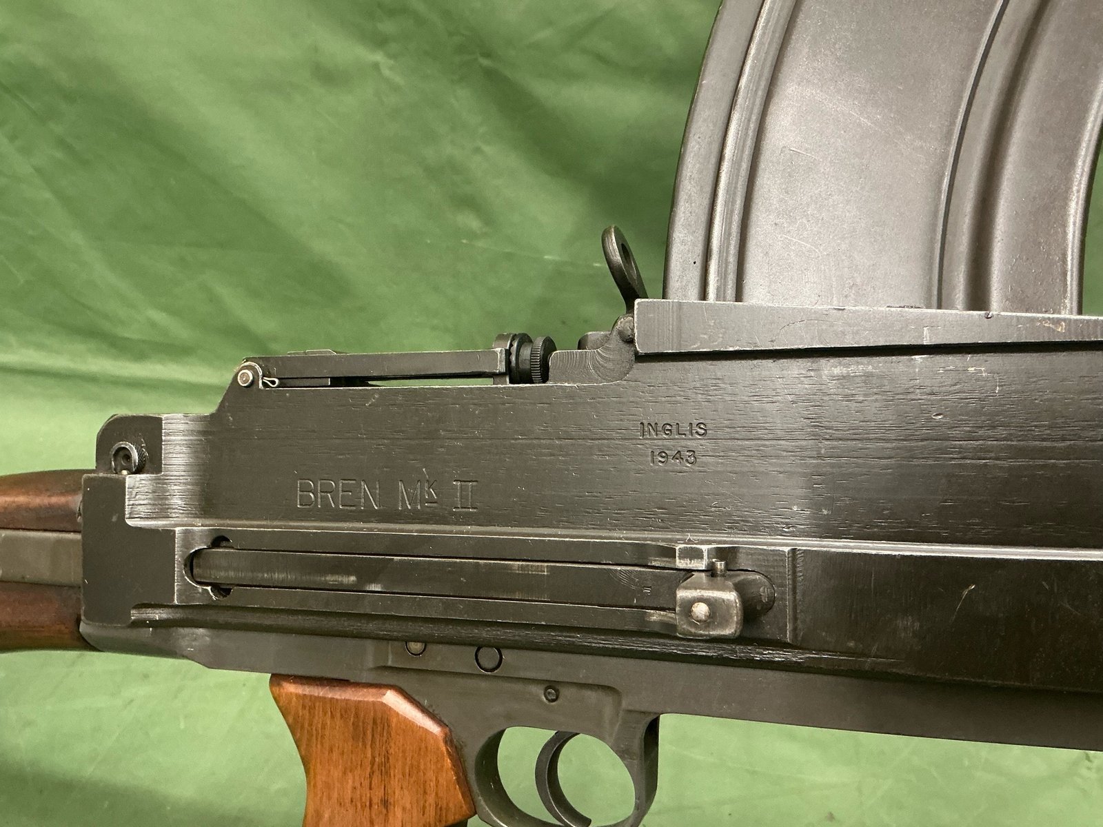 Deactivated World War II BREN MK2 machine gun, made in the Canadian factory of Inglis and dated 1943 ,with correct barrel, legs and butt. This example cock strips and dry fires comes complete with GB deactivation certificate dated 2000.
