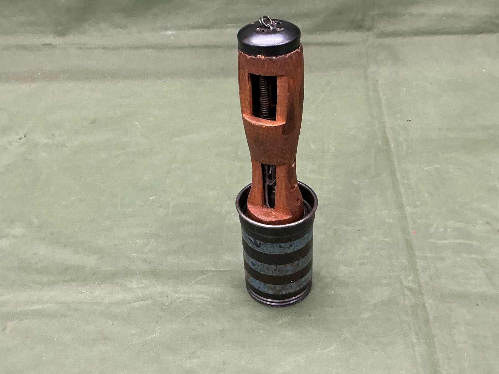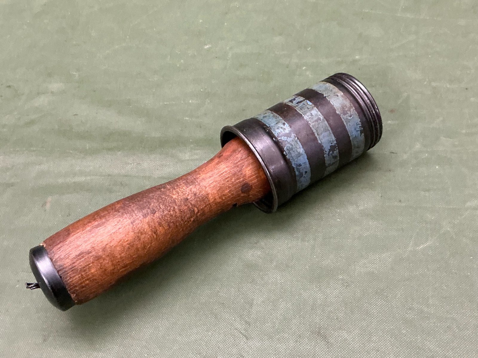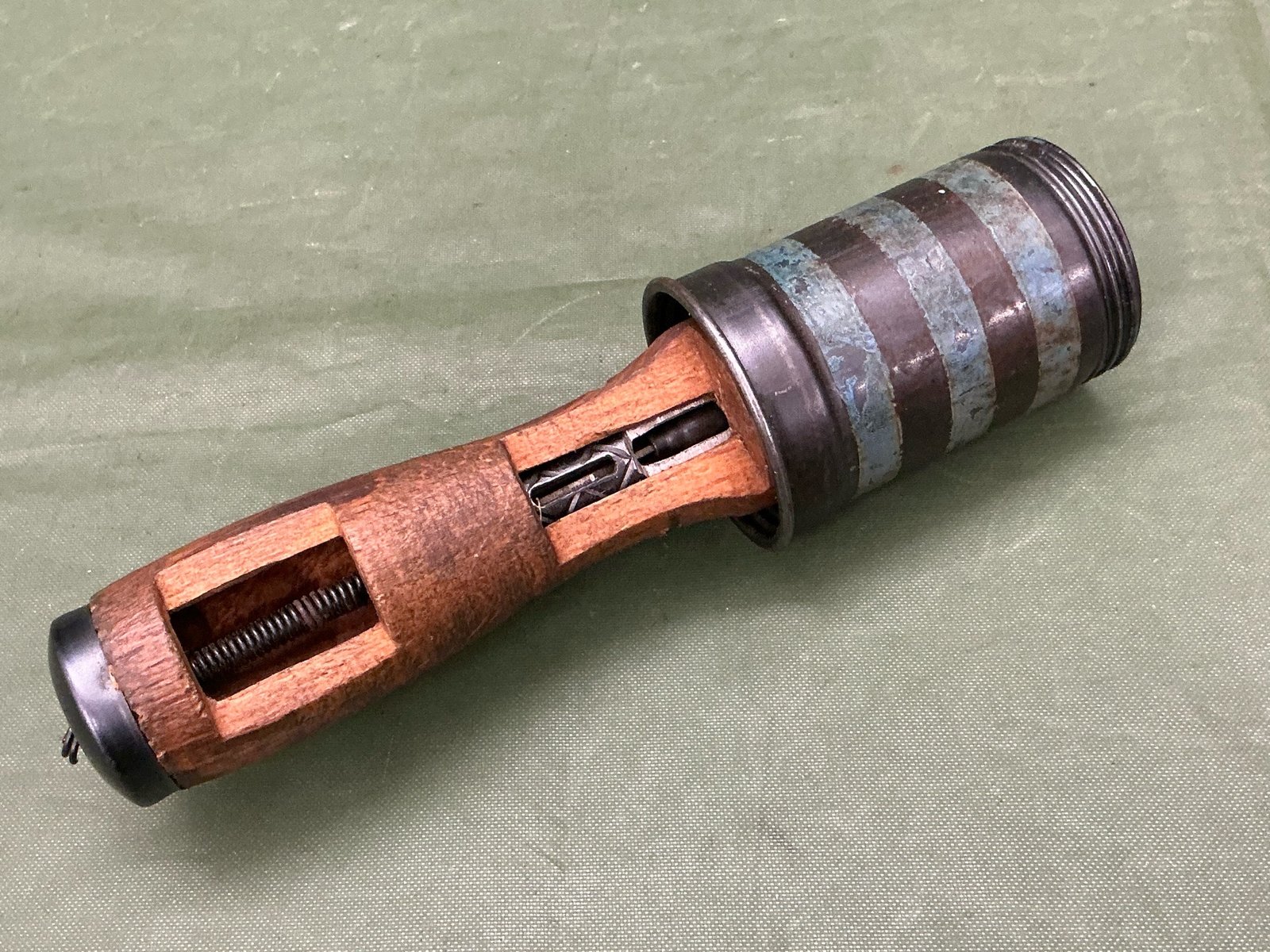 Inert Hungarian model 1942 stick grenade with blue paint to the head this example has been cut away to show the internal fusing system ,great overall condition and totally inert.
