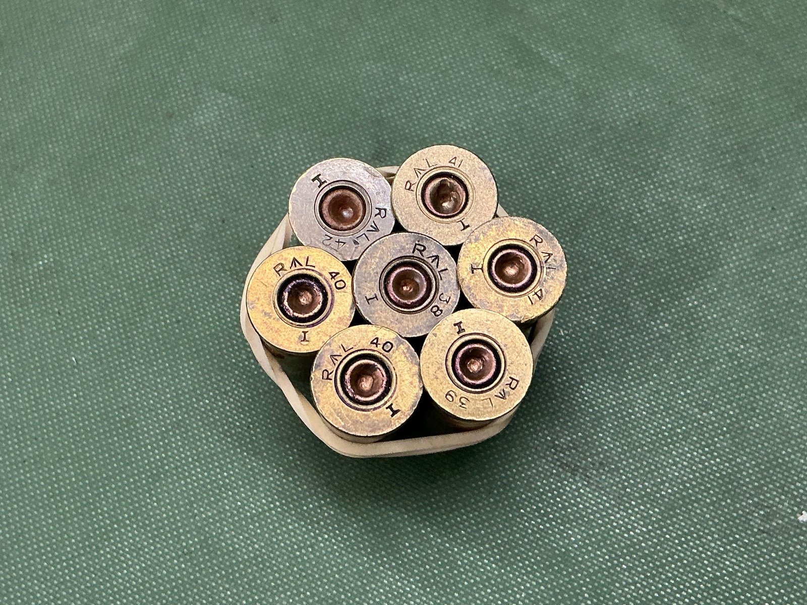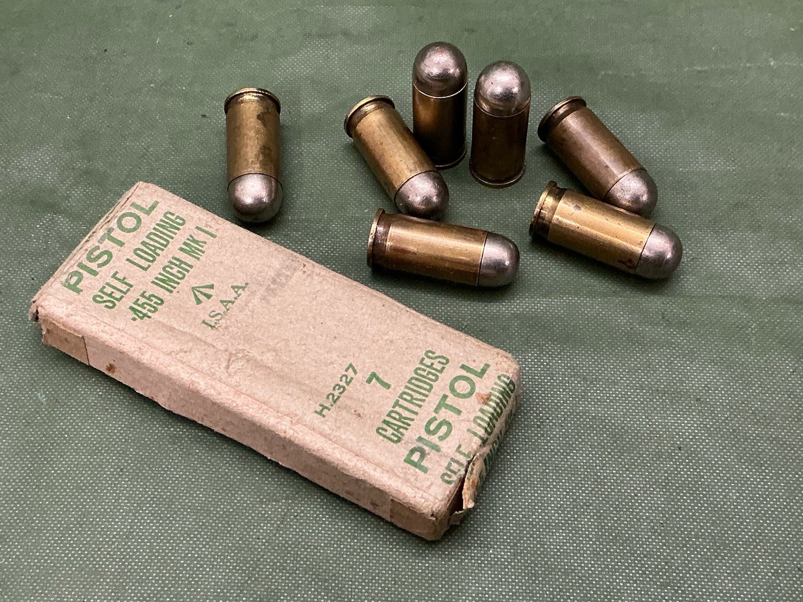 Extremely scarce inert Webley 455 auto rounds, all head stamps World War II dated, with cupro nickel projectiles,complete with scarce original cardboard box extremely hard to find.