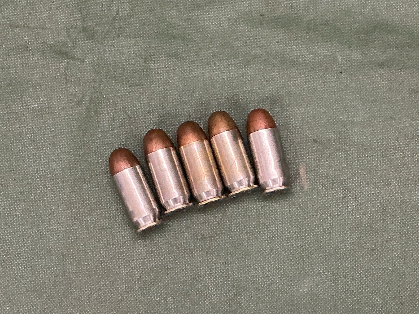 5 inert World War II 45 ACP steel cases with copperheads all heads stamps are matching maker of FA for Frankford Arsenal and all dated 1942.