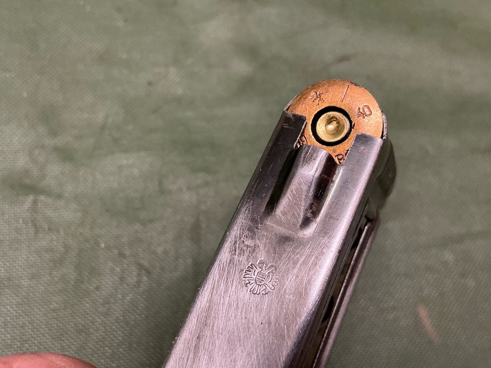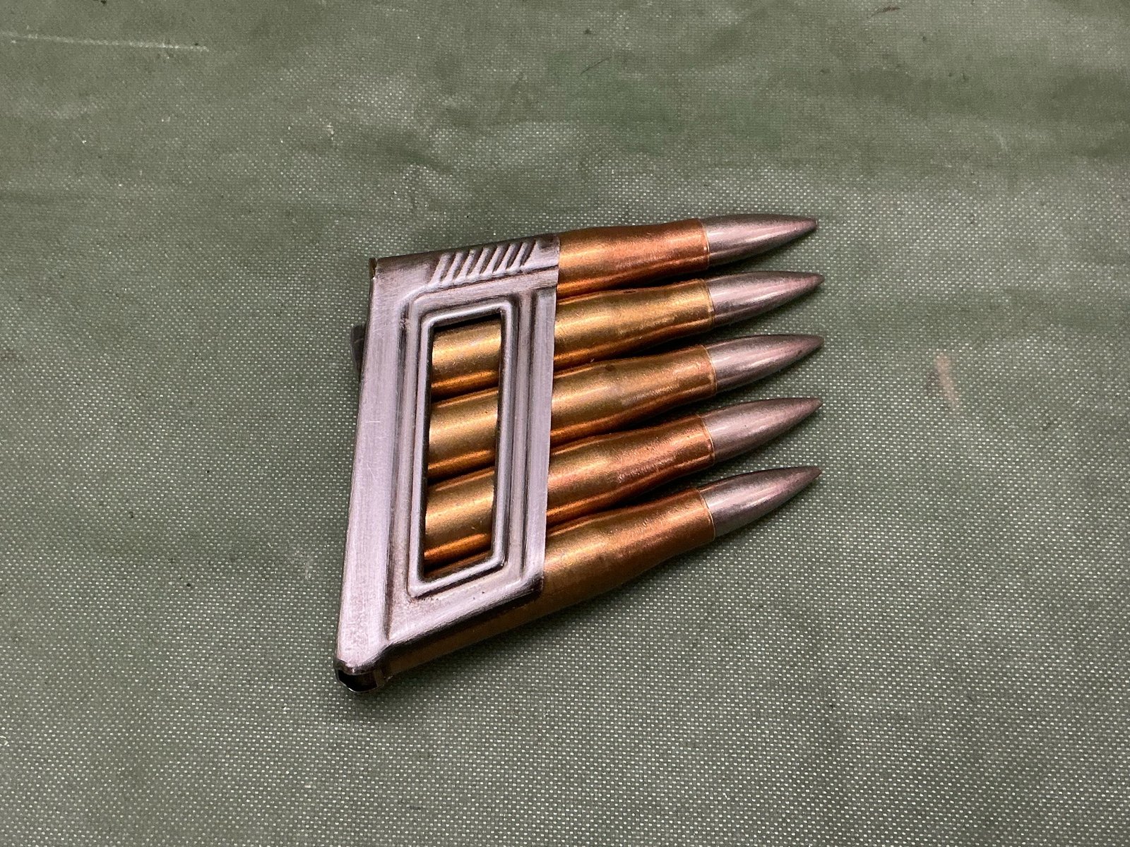 Five inert World War II Austrian marked Steyr M 95 rounds all with matching head stamps all dated 1940 with Austrian crest to the head stamp and Austrian crest to the clip with cupro nickel projectiles ,nice item to find.