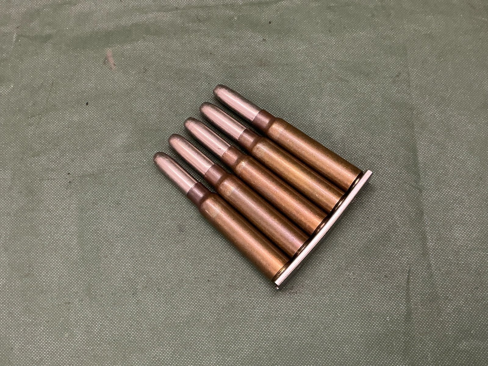 5 inert 7.65x 54 FN Belgium Mauser rounds on clip all headstamps stamped FN dated 39 with early cupro nickel round nosed projectiles,scarce round to find.