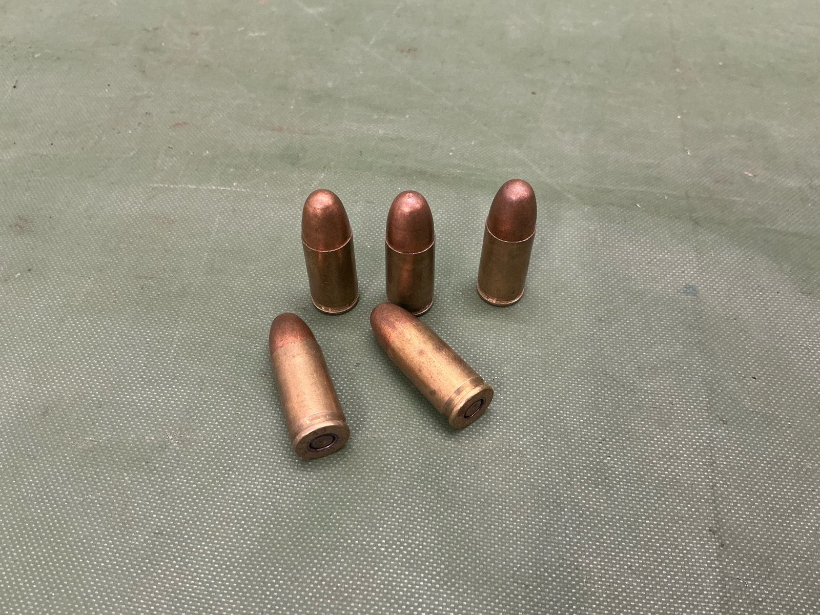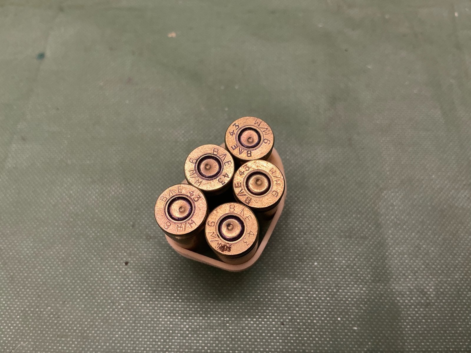 5 inert World War II British made 9 mm rounds, all with matching heads stamp, dated 1943 maker marked BE with a broad arrow in between for the Royal Ordnance Factory Blackpole, nice item to find matching.