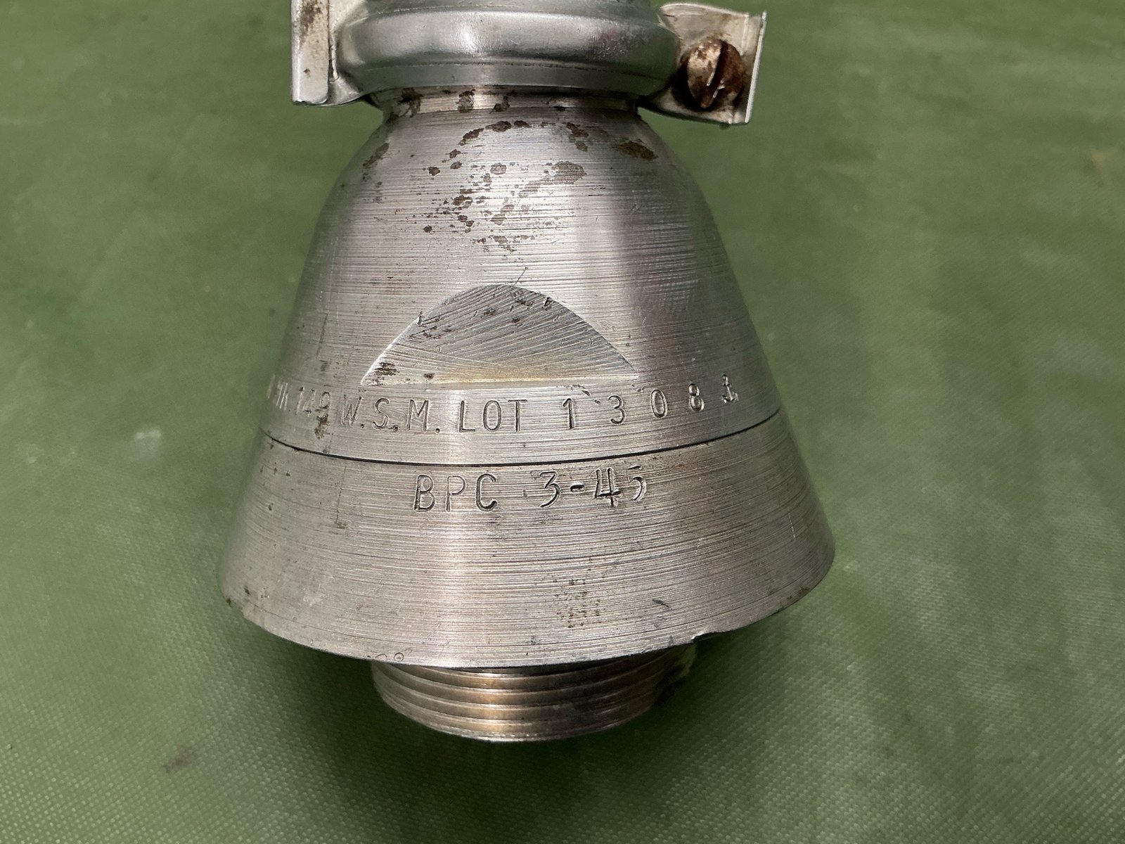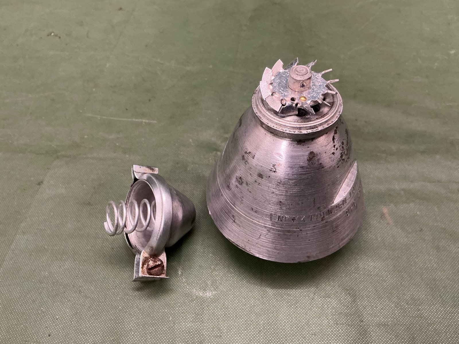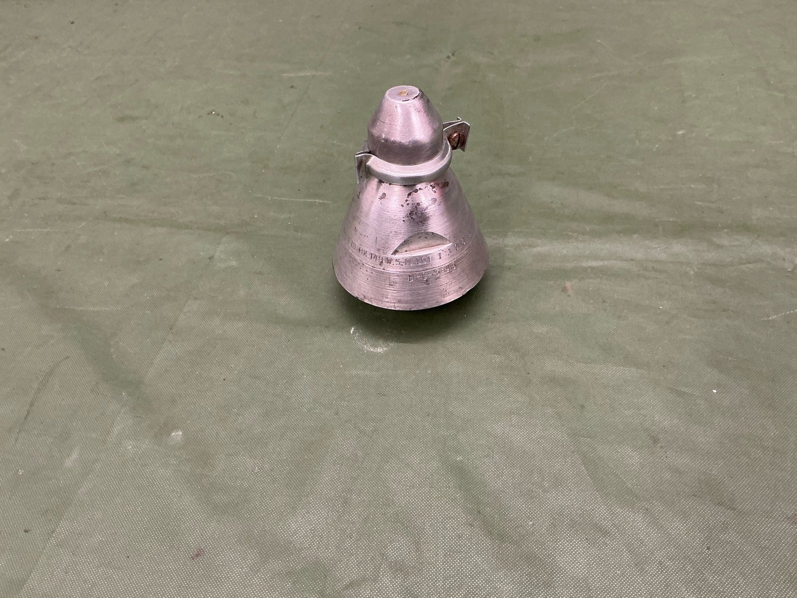 A 1945 dated fuse used by the RAF on the rocket firing typhoons. The fuse has a spring loaded cap to it which once undone reveals the spinning fuse which is used to arm the rocket whilst in flight used with devastating affect in Normandy.