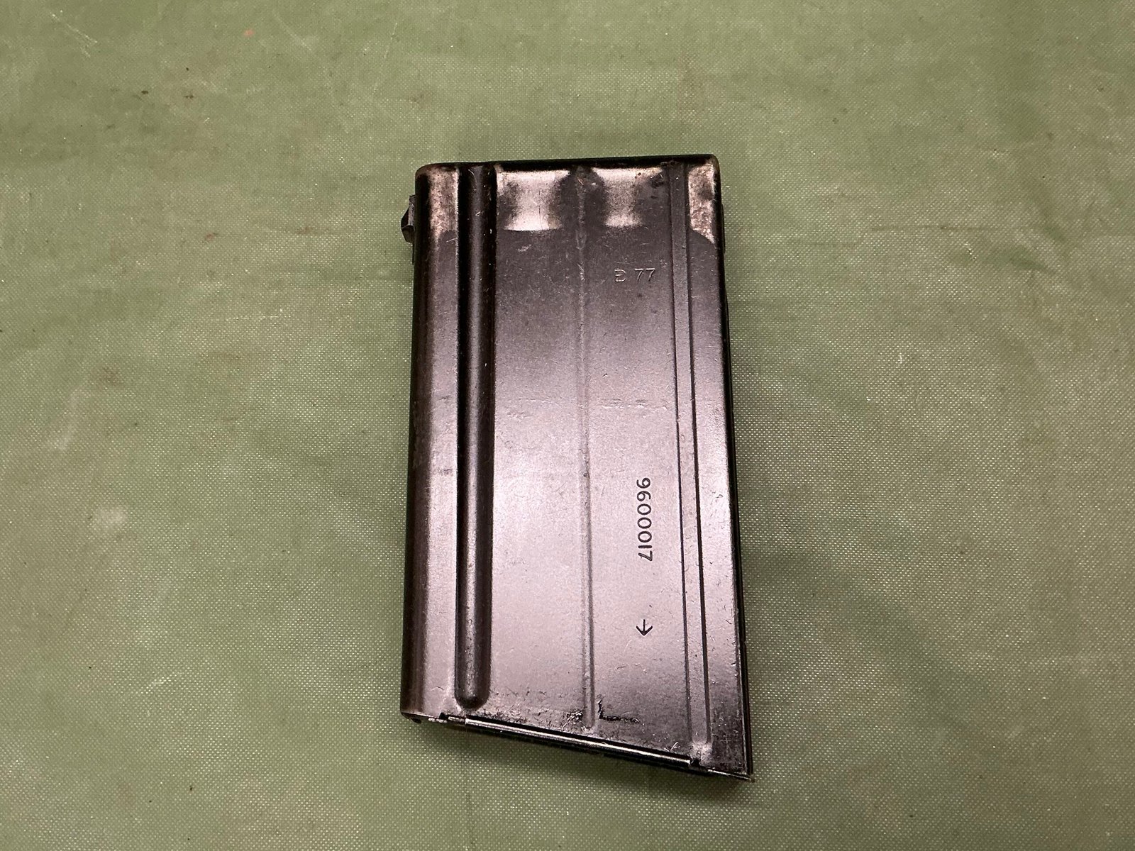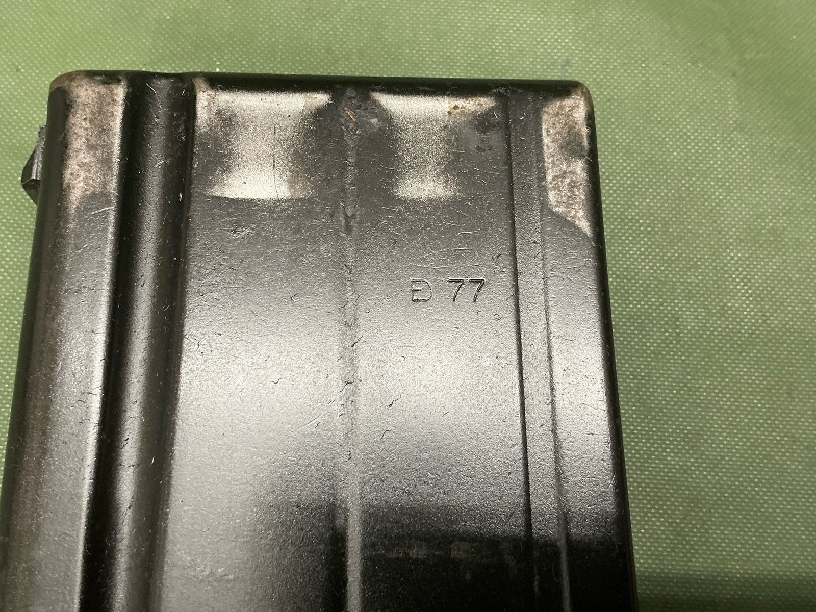 A metal magazine for the classic British L1A1 SLR rifle this example has Enfield logo and date of 77 stamped to the left side also number 960 0017 with a broad arrow underneath.