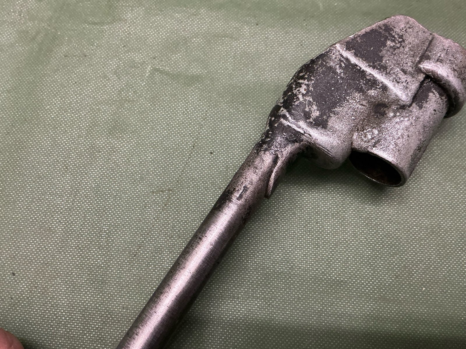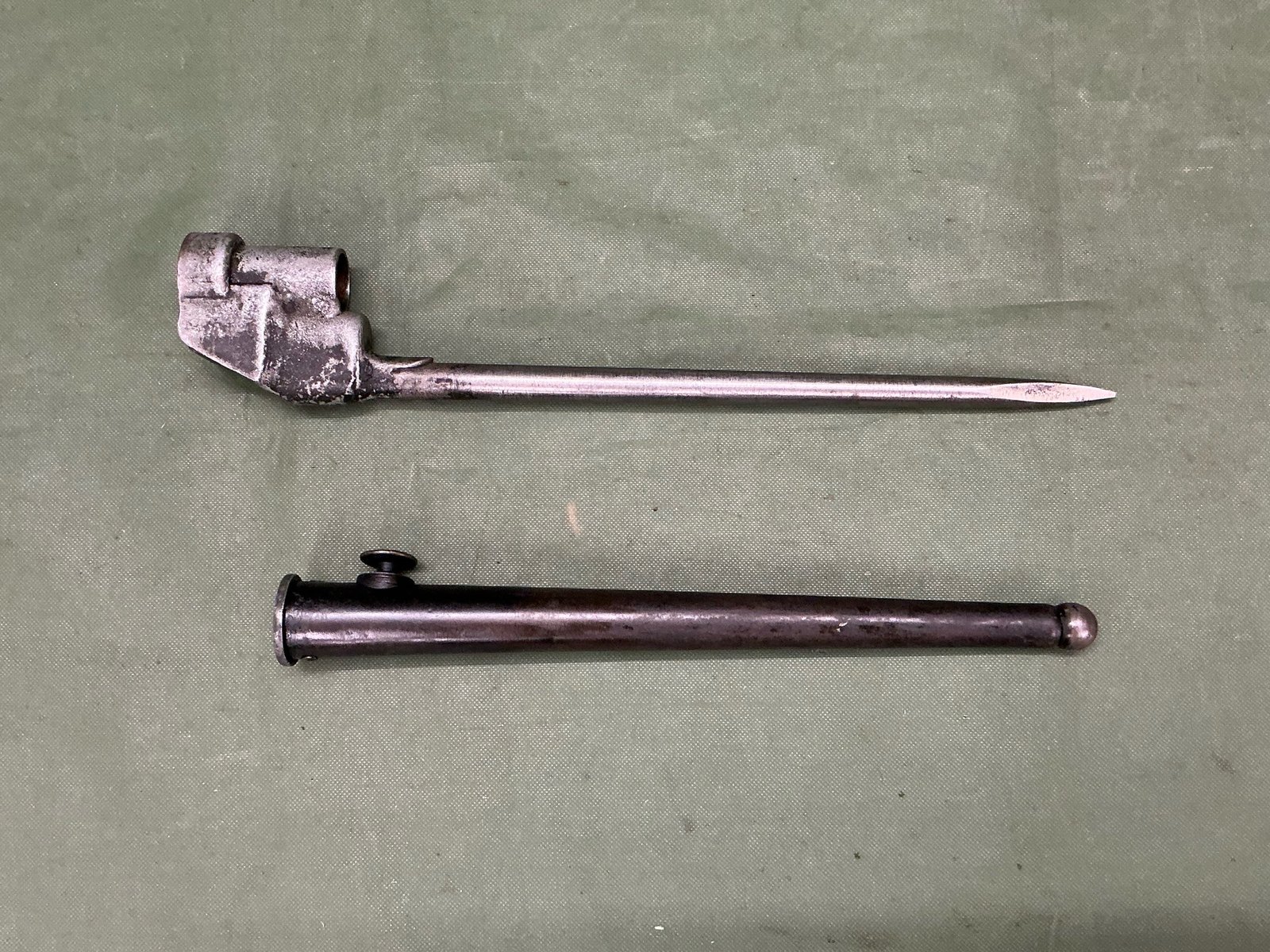 MK3 PIG STICKER BAYONET FOR THE LEE ENFIELD NO4 RIFLE WITH ITS UNIQUE SOCKET CASTING AND L MARK TO THE BLADE FOR LUCAS, COMPLETE WITH STEEL SCABBARD.