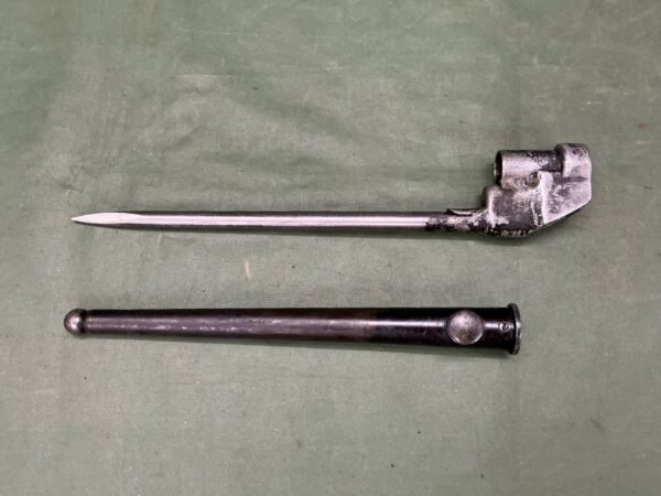 MK3 PIG STICKER BAYONET FOR THE LEE ENFIELD NO4 RIFLE WITH ITS UNIQUE SOCKET CASTING AND L MARK TO THE BLADE FOR LUCAS, COMPLETE WITH STEEL SCABBARD.