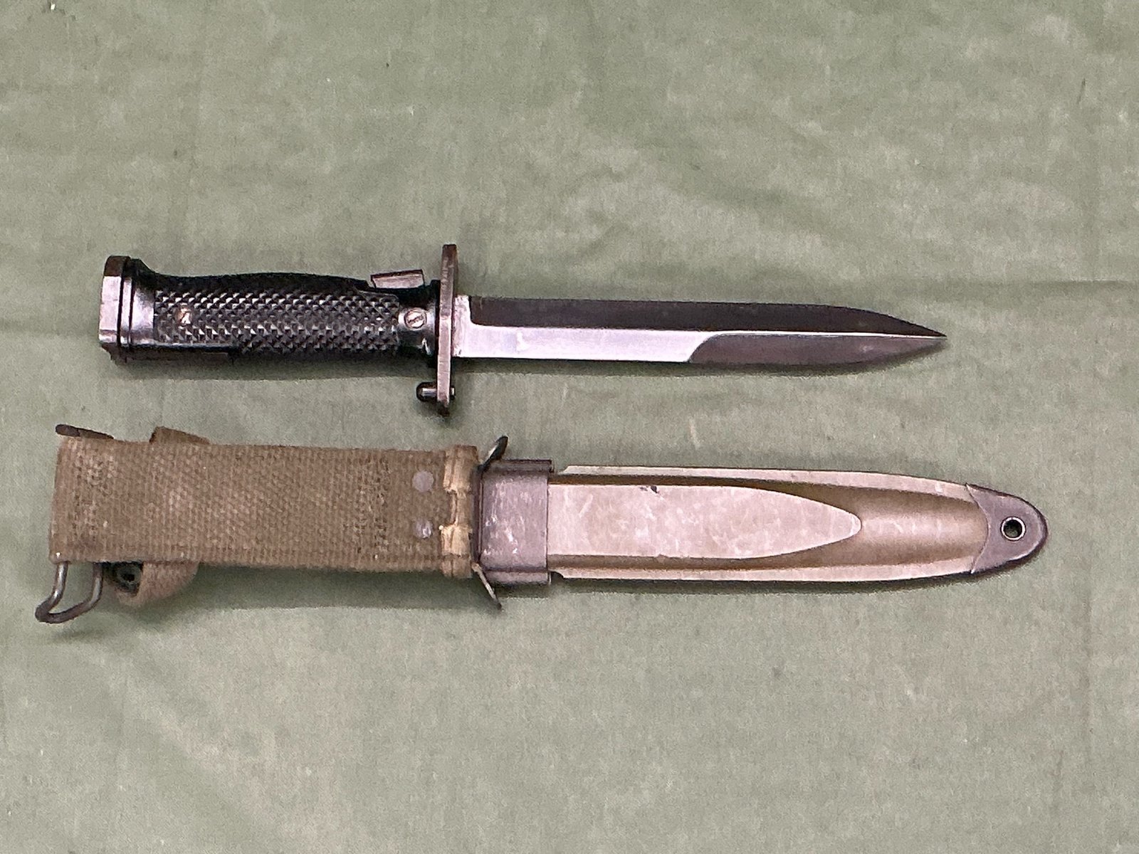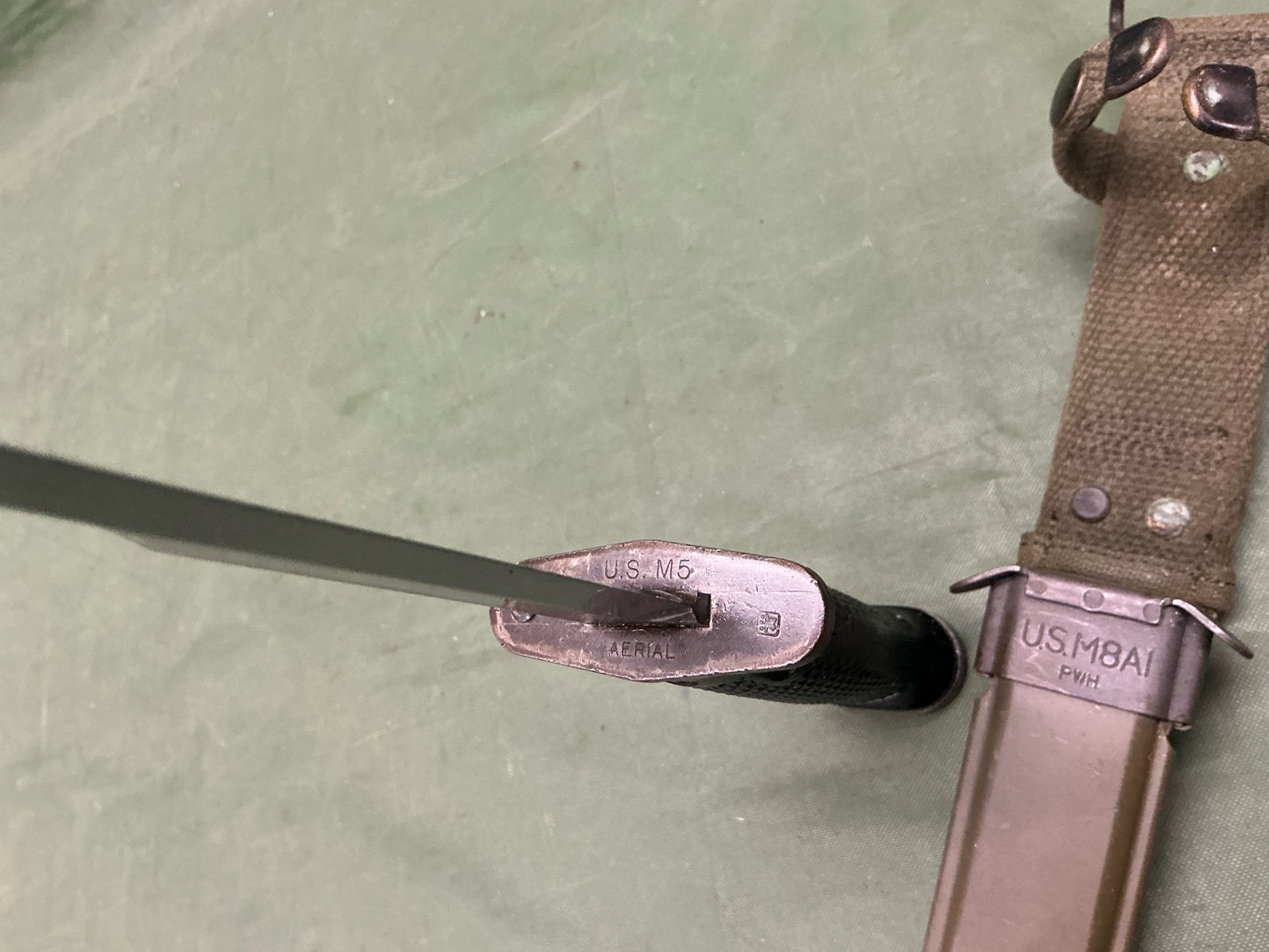 American M5 A1 bayonet fully M1 Garand rifle this example made by the Aerial Cutlery manufacturing company of Marionette ,Wisconsin and was one of 80,000 M5 is made in 1957 , nicely mulch and a good overall example complete with scabbard.