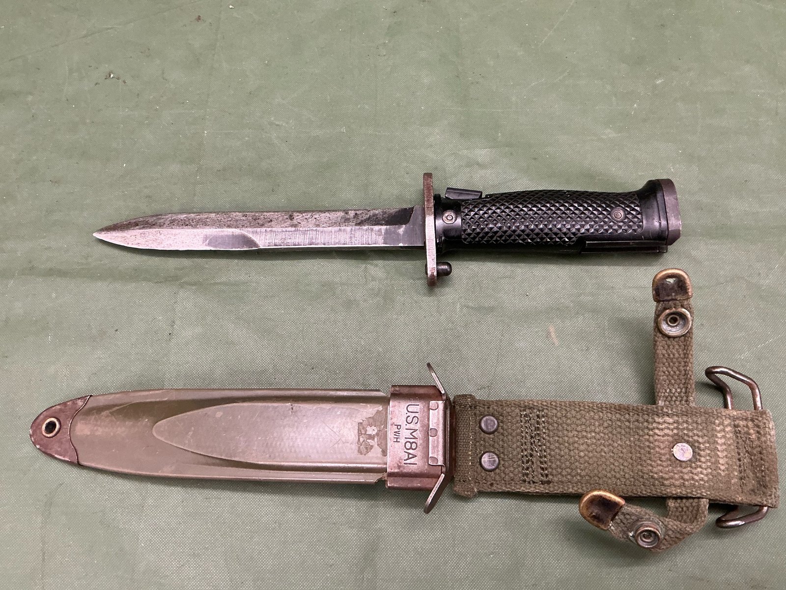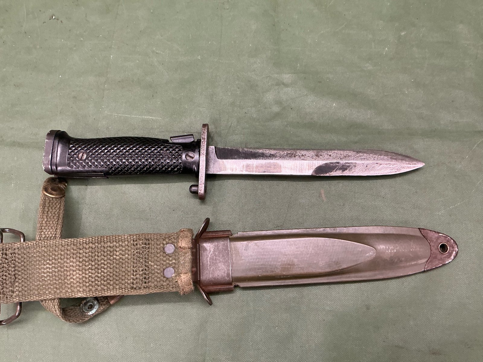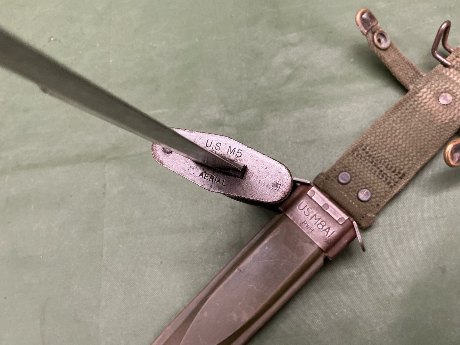 American M5 A1 bayonet fully M1 Garand rifle this example made by the Aerial Cutlery manufacturing company of Marionette ,Wisconsin and was one of 80,000 M5 is made in 1957 , nicely mulch and a good overall example complete with scabbard.