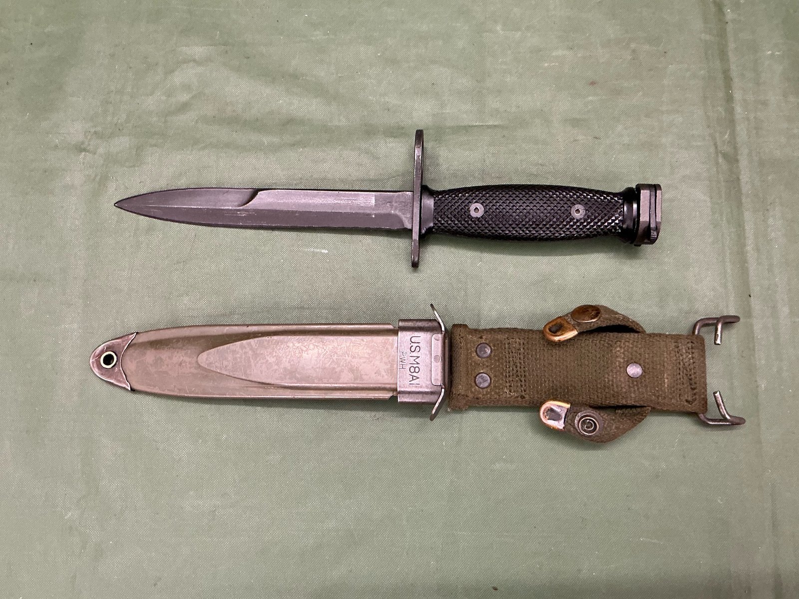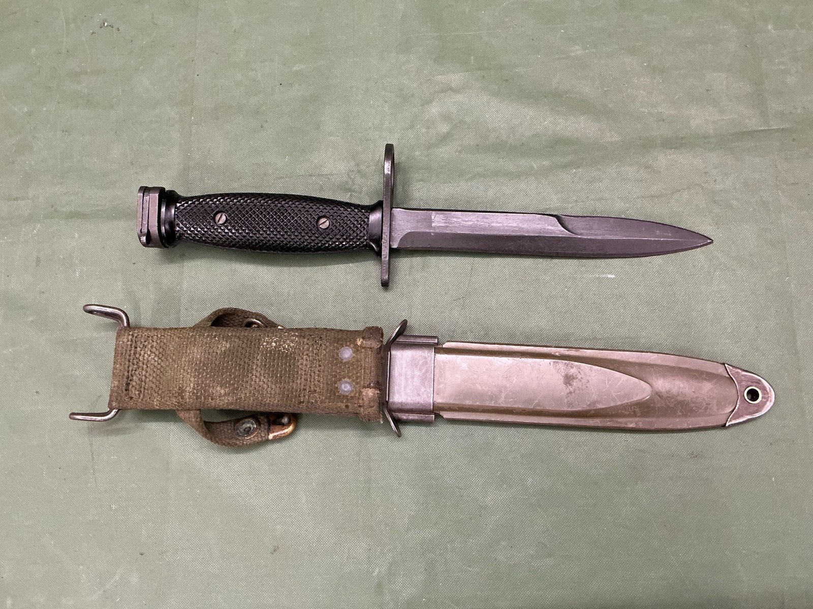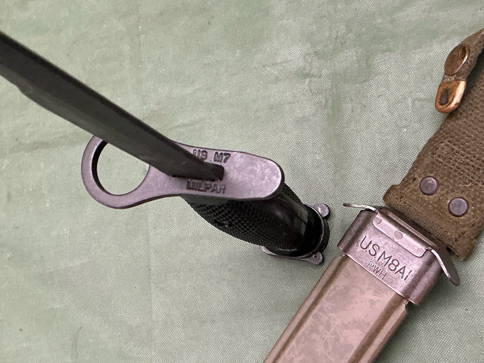 M7 Bayonet for the American M-16 A1 rifle this example made by the Milpar,Columbus Milpar manufacturing company and dates between 1965 to 1969 ,almost mint condition complete in its USM8A1 scabbard .