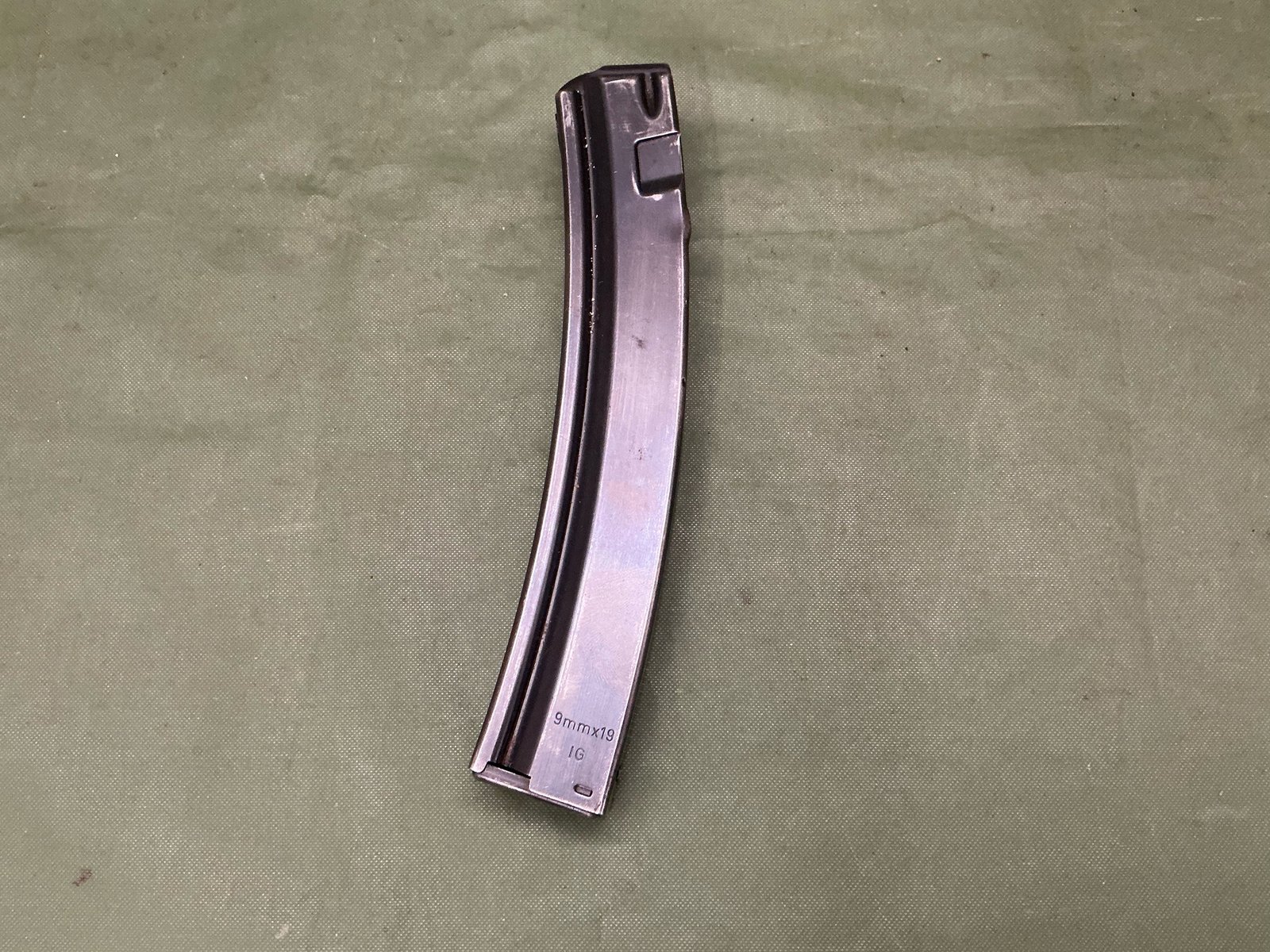 Metal magazine for the MP5 9 mm SMG base of left side magazine marked 9MM x19 with IG underneath.