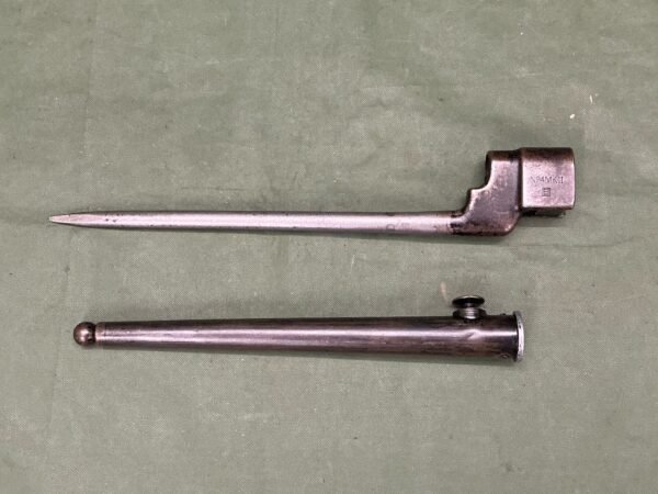 NO4 MK2 pig sticker bayonet for the Lee Enfield NO4 rifle made by American company of Savage under the ww2 lend lease agreement .This example has the large capital S in a square on the body and bayonet release button comes complete with steel scabbard.