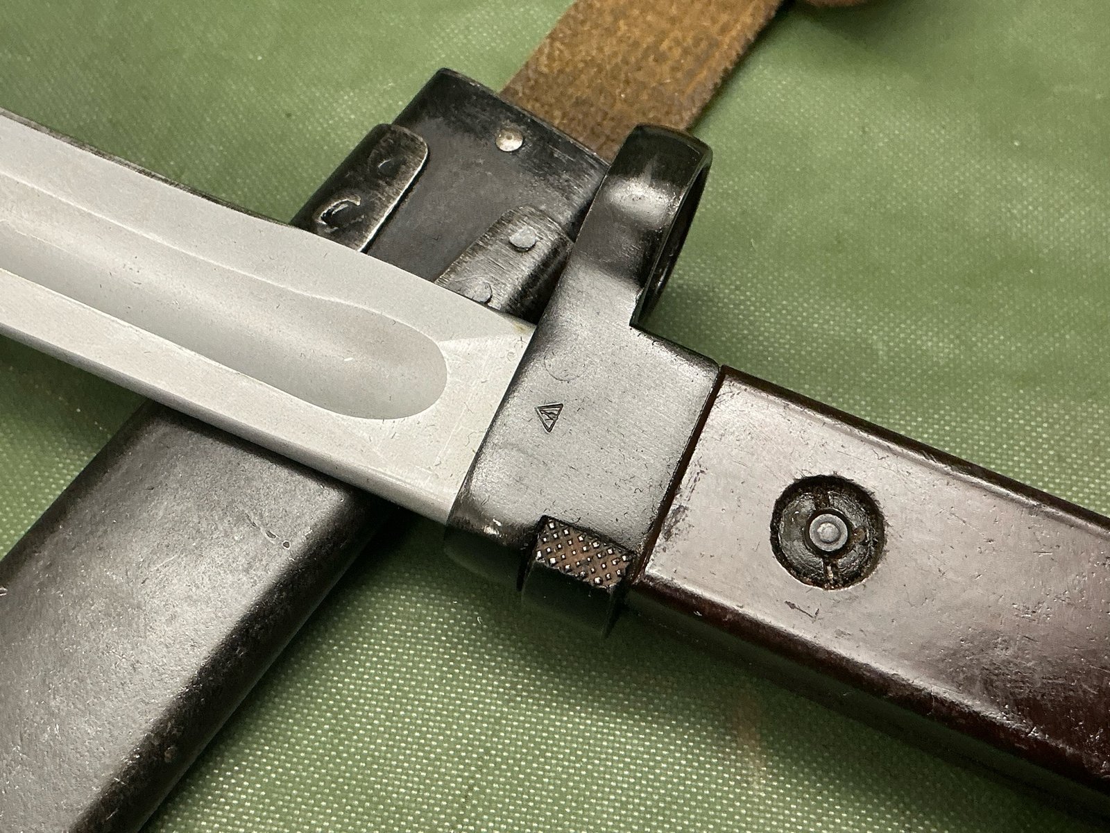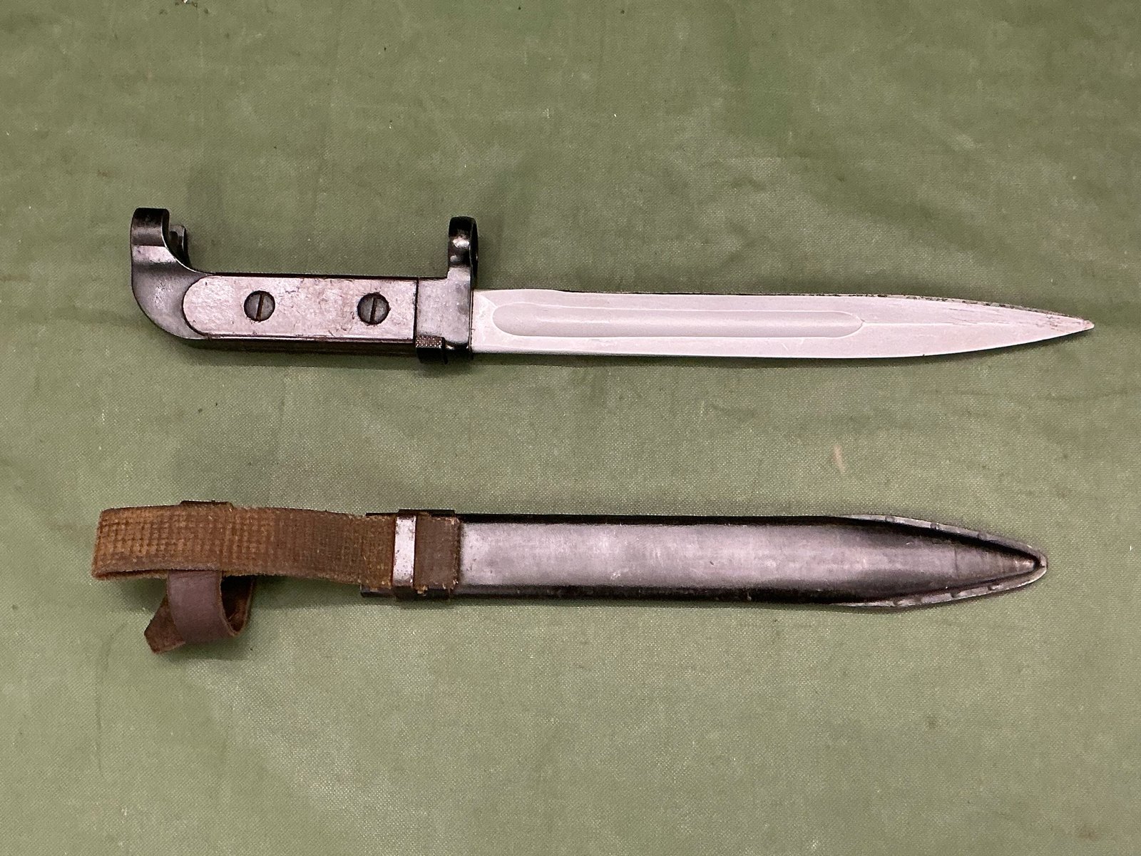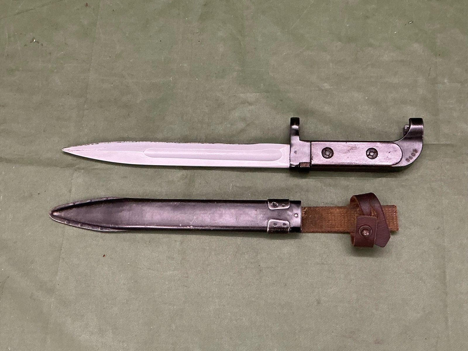 Russian Type 1 Model 1951 bayonet with plum coloured grips and numbered to the pommel and arsenal marked for Izhevsk,complete with steel scabbard with leather and canvas belt loop frog.