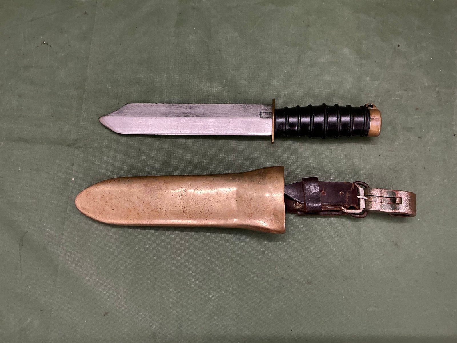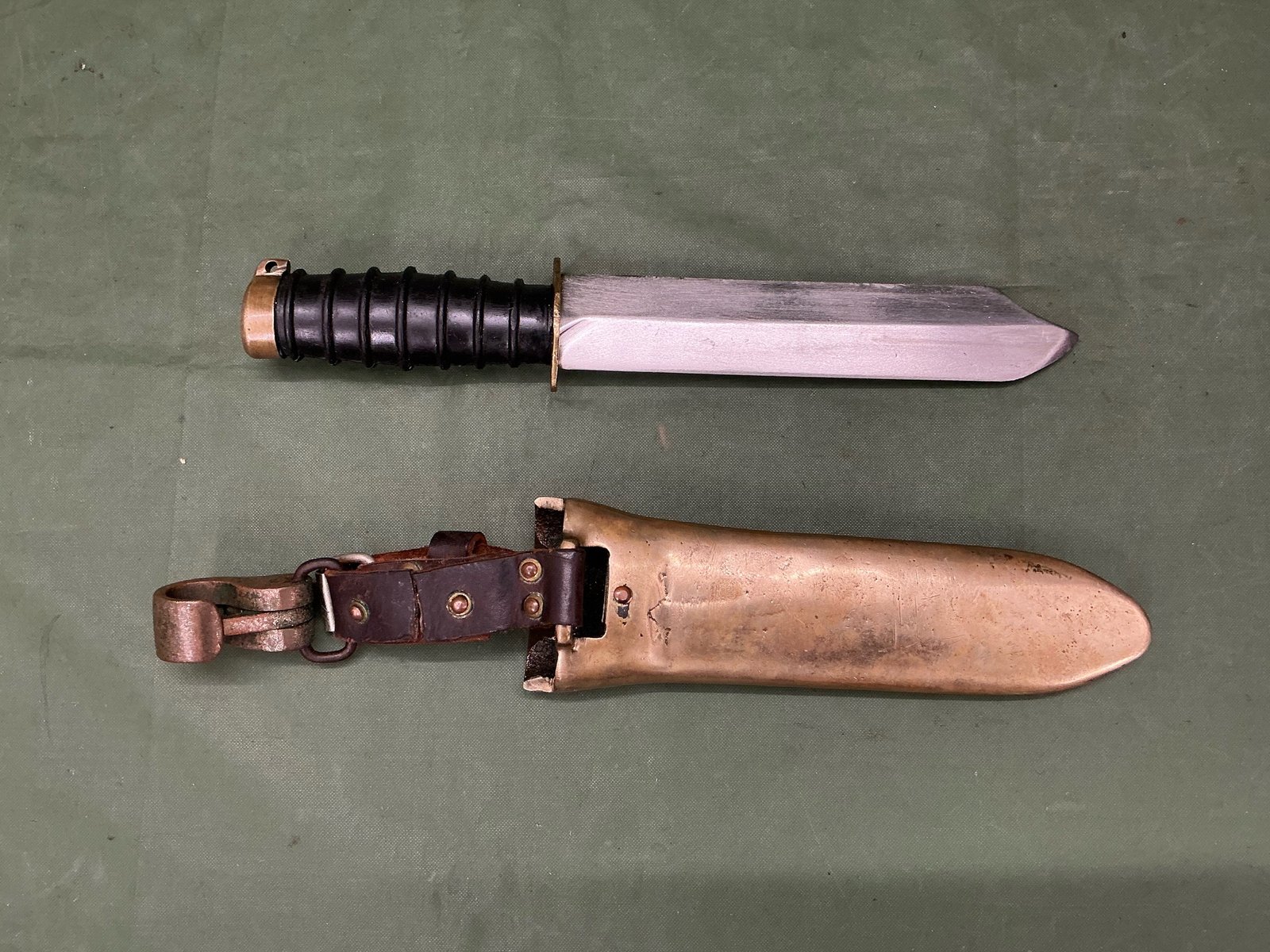 A lovely Russian Nv-1 divers knife ,extremely well-made and and heavy has black rubber grip, heavy brass scabbard with extremely heavy duty belt loop and brass clasp end of pommel marked 11 OTK ,really nice example and hard to find.