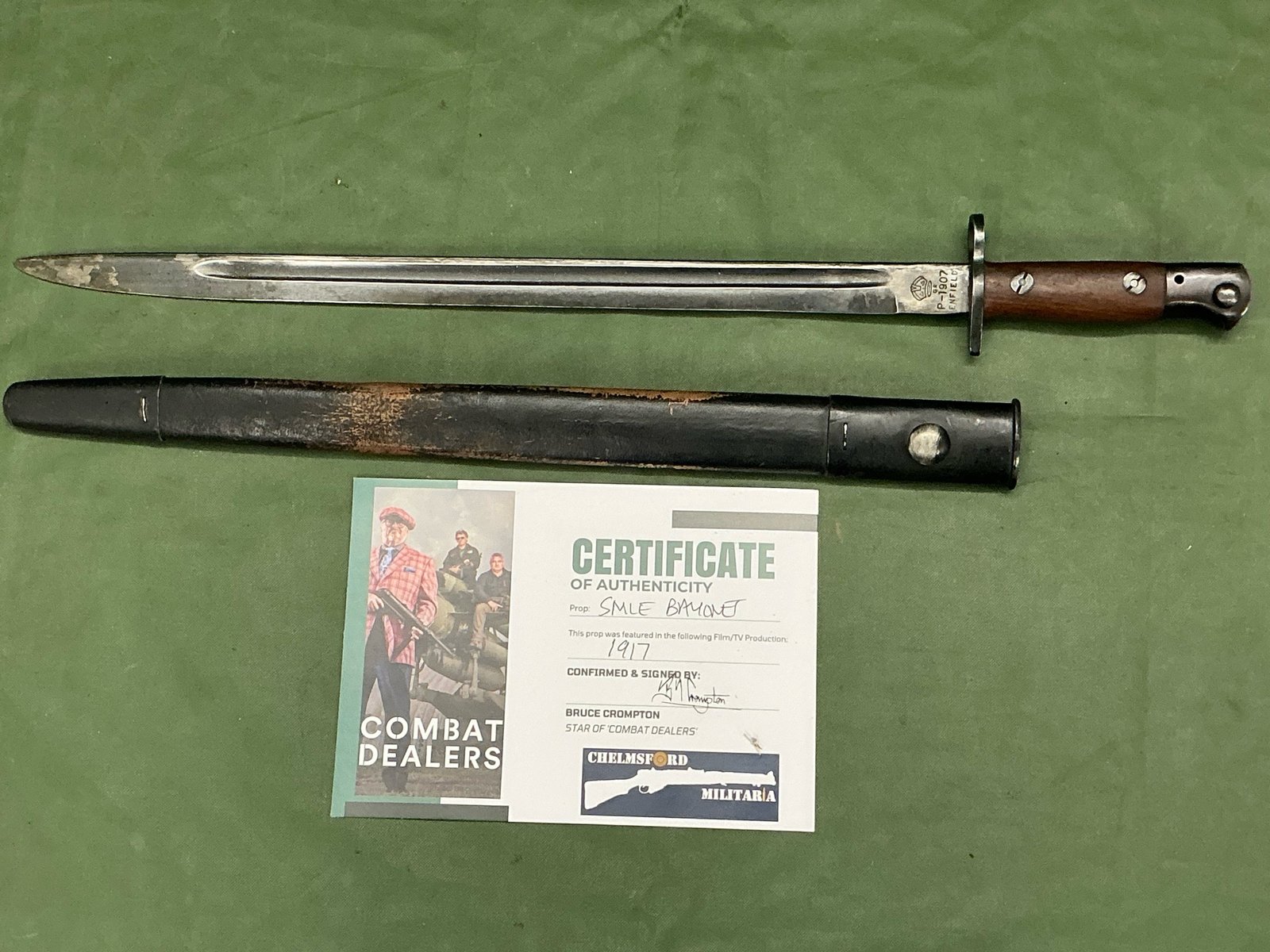 FULL SIZE METAL BAYONET WITH WOODEN GRIPS AND LEATHER SCABBARD EXTREMELY GOOD COPY MADE FOR THE MOVIE 1917, COMES WITH SIGNED CERTIFICATE OF AUTHENTICITY FROM COMBAT DEALERS BRUCE CROMPTON,WILL FIT A DEACTIVATED SMLE