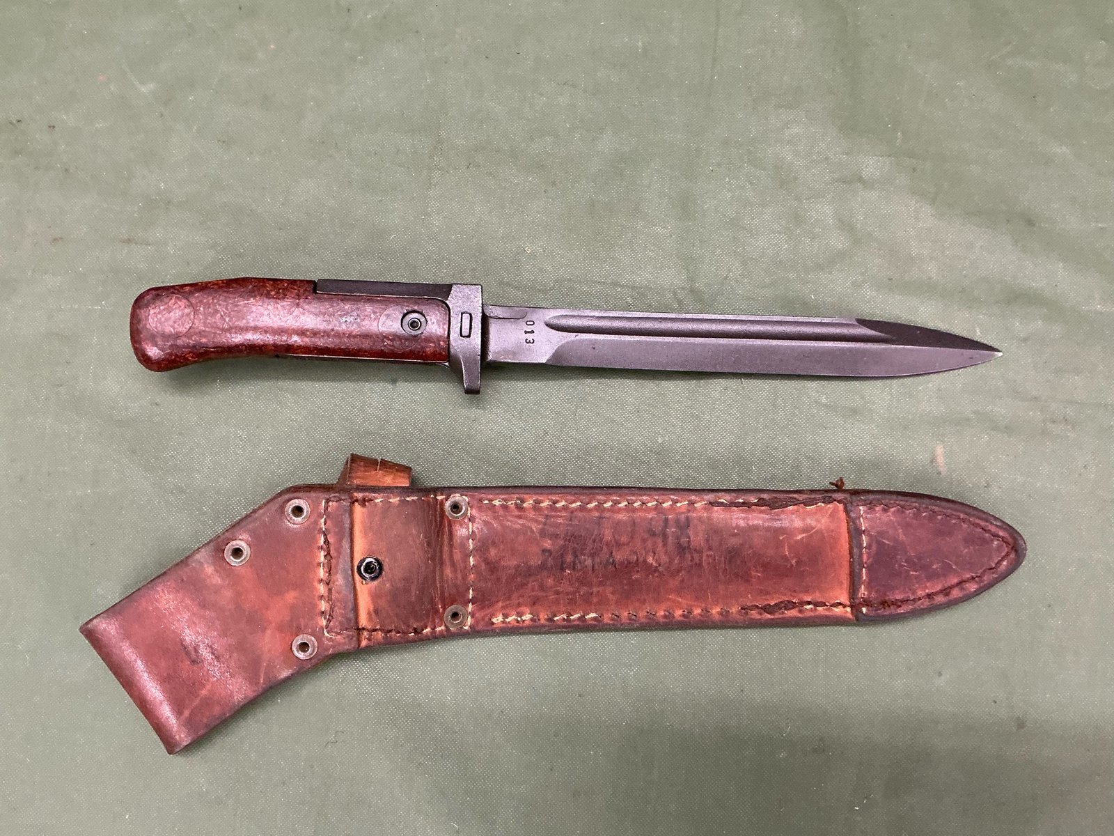 NICE CONDITION BAYONET FOR THE VZ58 WITH LEATHER SCABBARD WITH SINGLE RIVET AND NO TANG .