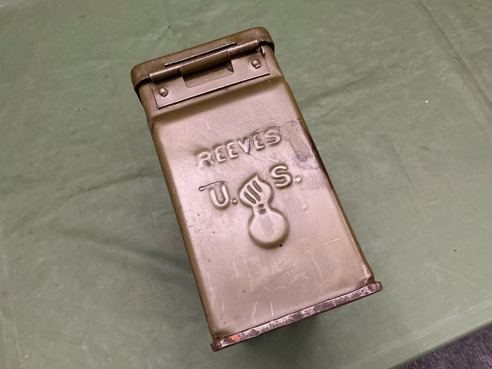 World War II American 30 calibre machine gun tin with US flaming grenade and maker marked REEVES a nice unrefurbished example.