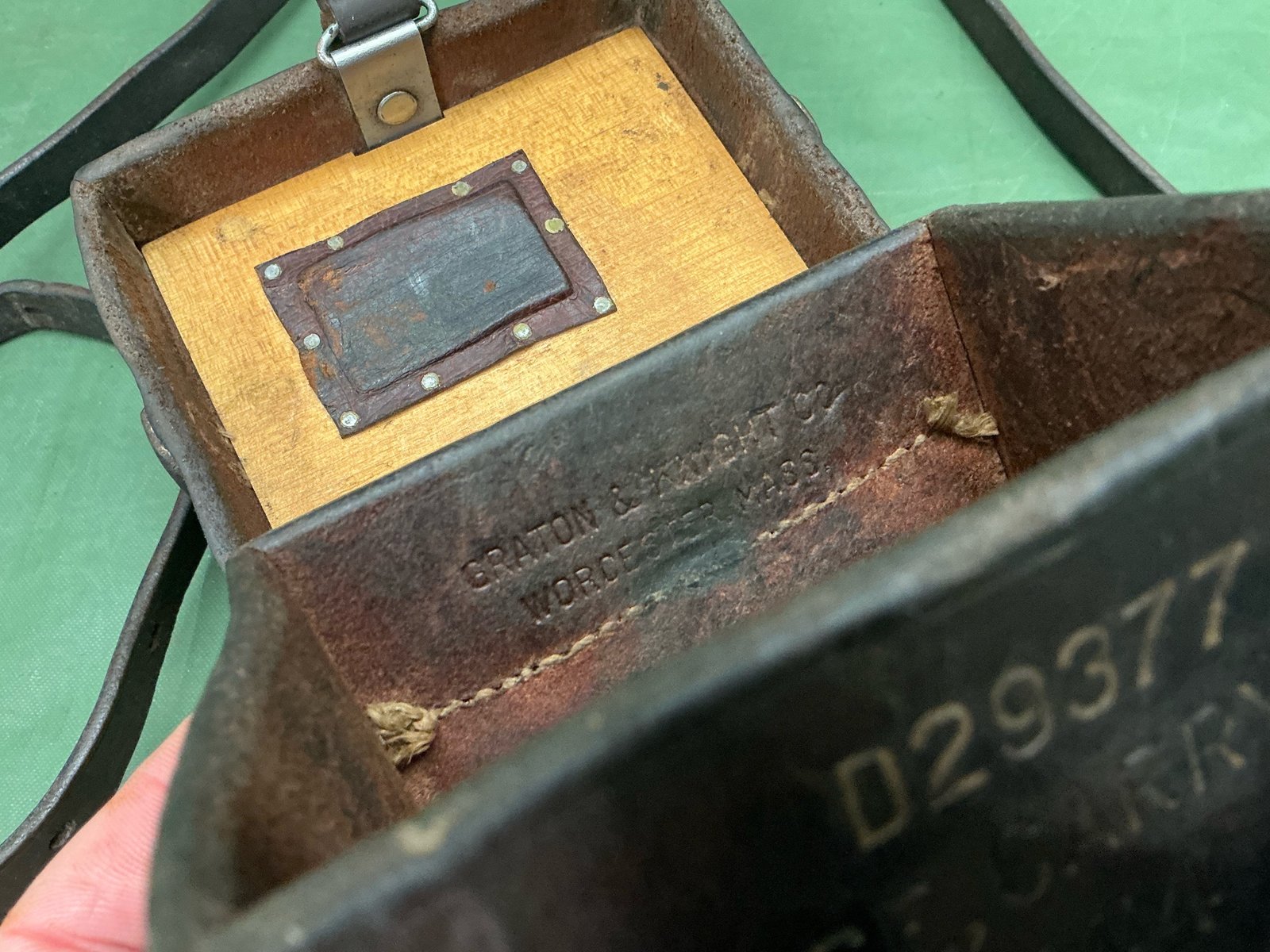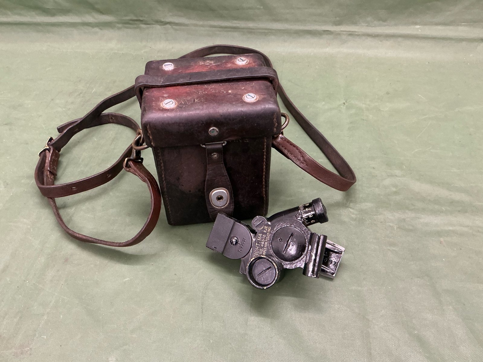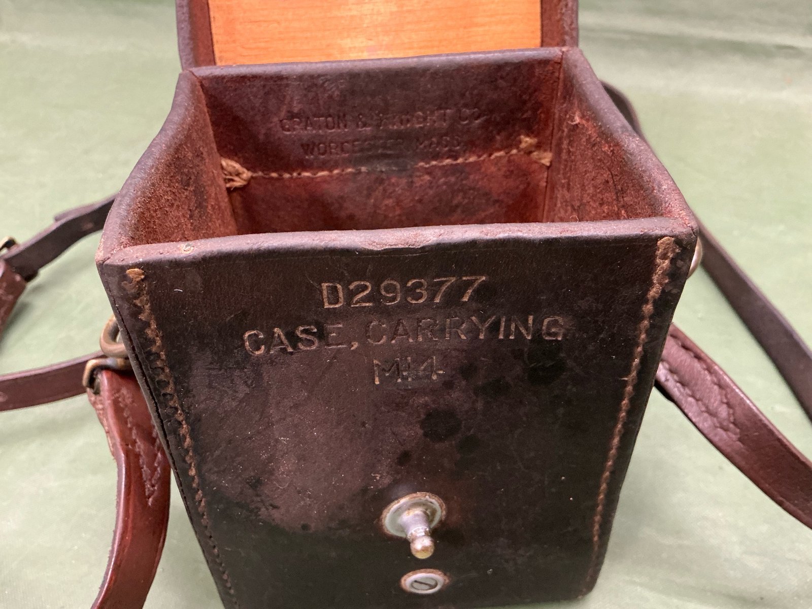 World War II American 60 mm Mortar M4 sight dated 1943 in working order complete with intact bubble for level and complete in leather carry case and strap made by the GRATON & KNIGHT CO, WORCESTER, MASS. a lovely item to find.