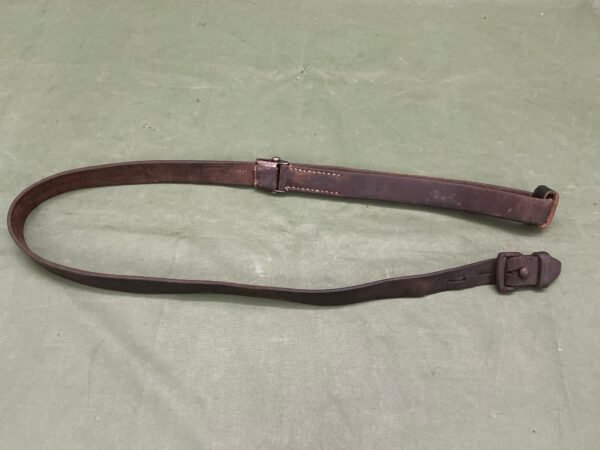 World War II original German k98 Mauser rifle sling maker marked L&F for Linden & Funke KG ,Iserlohn,has correct three holes at tab end ,complete with steel studded keeper,leather still lovely and supple.
