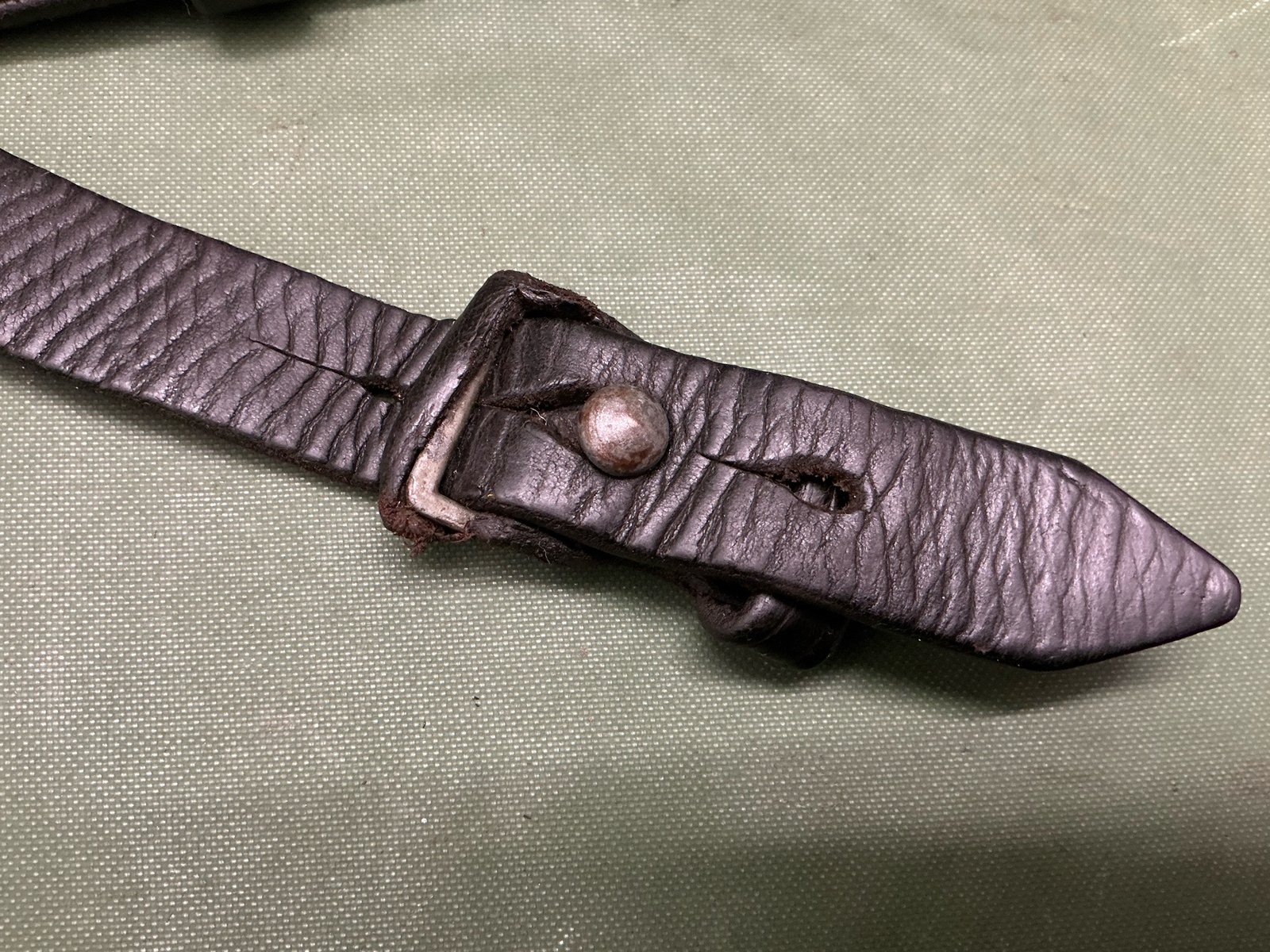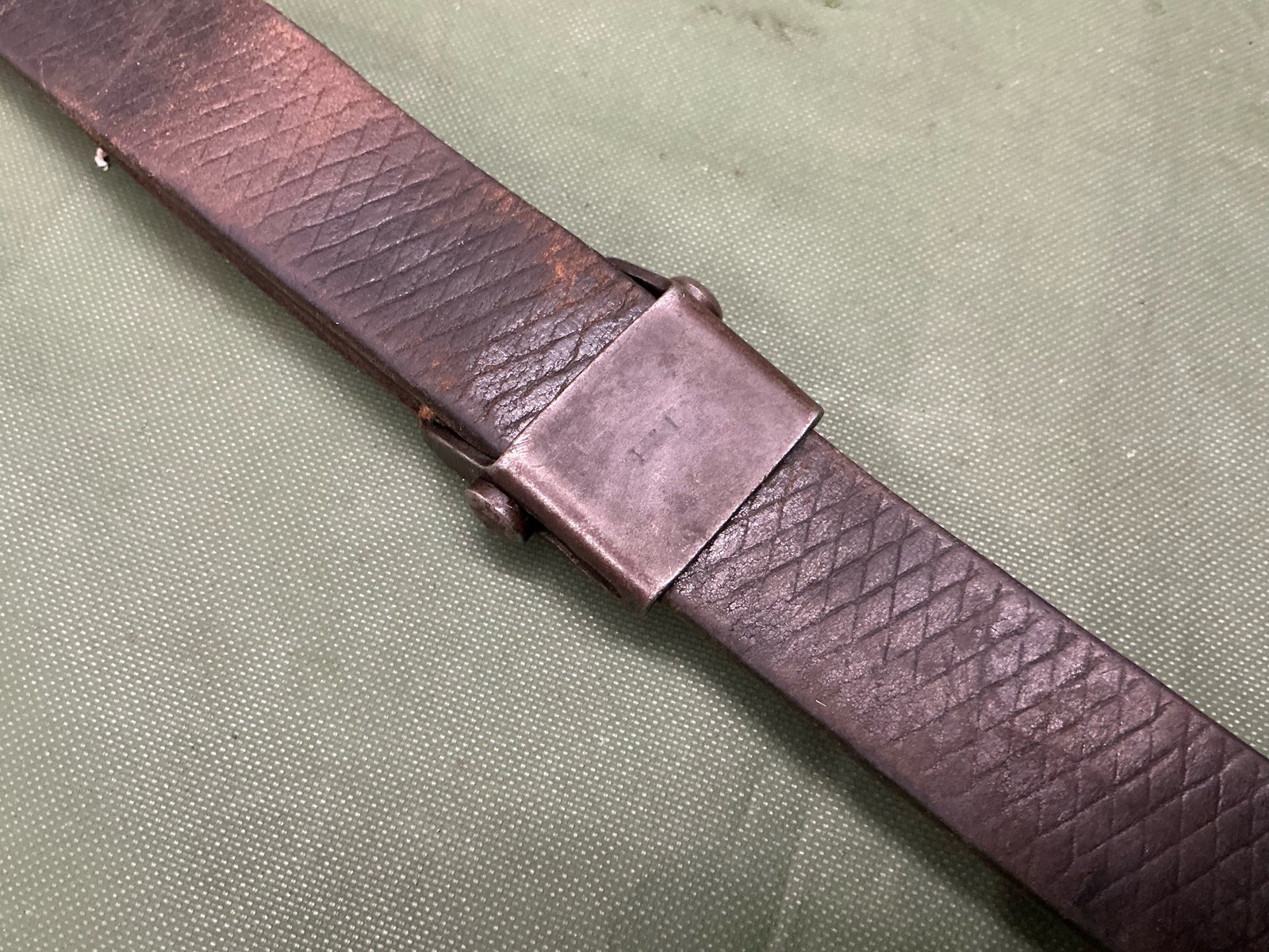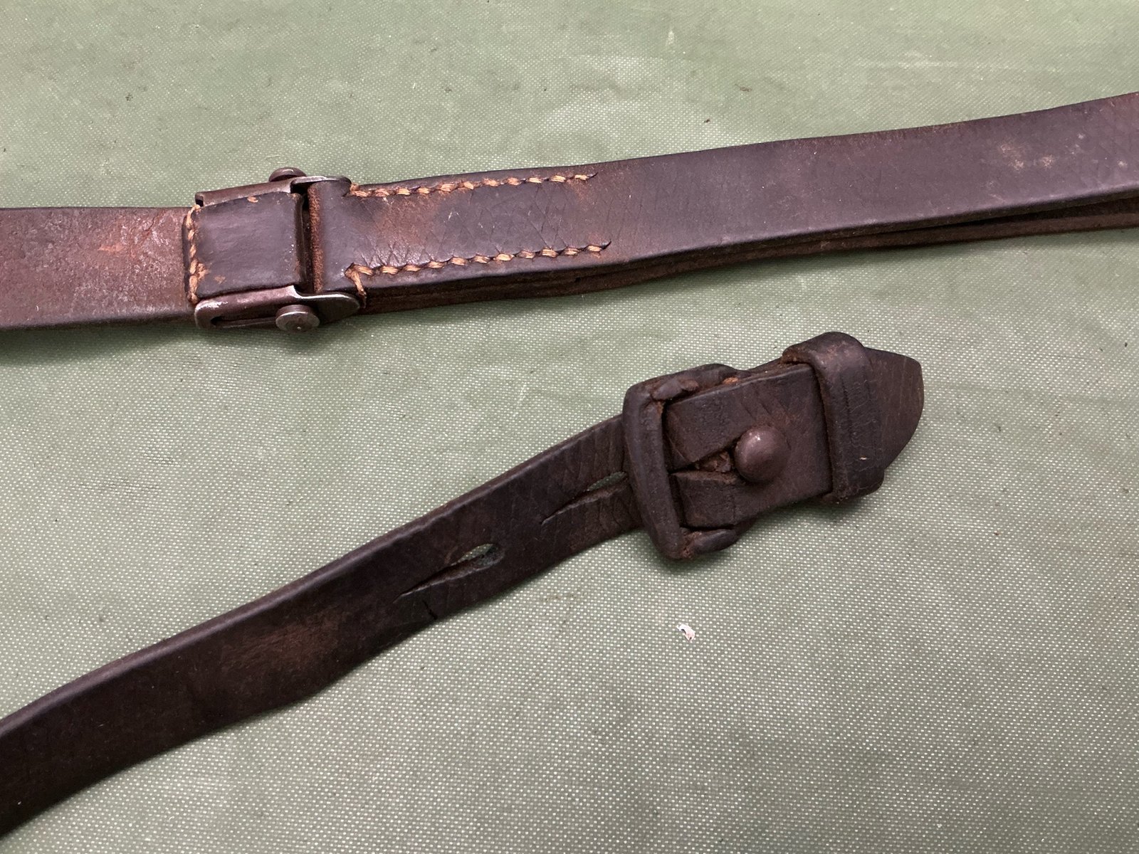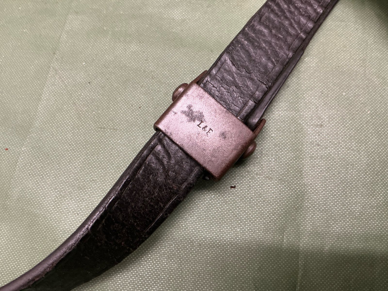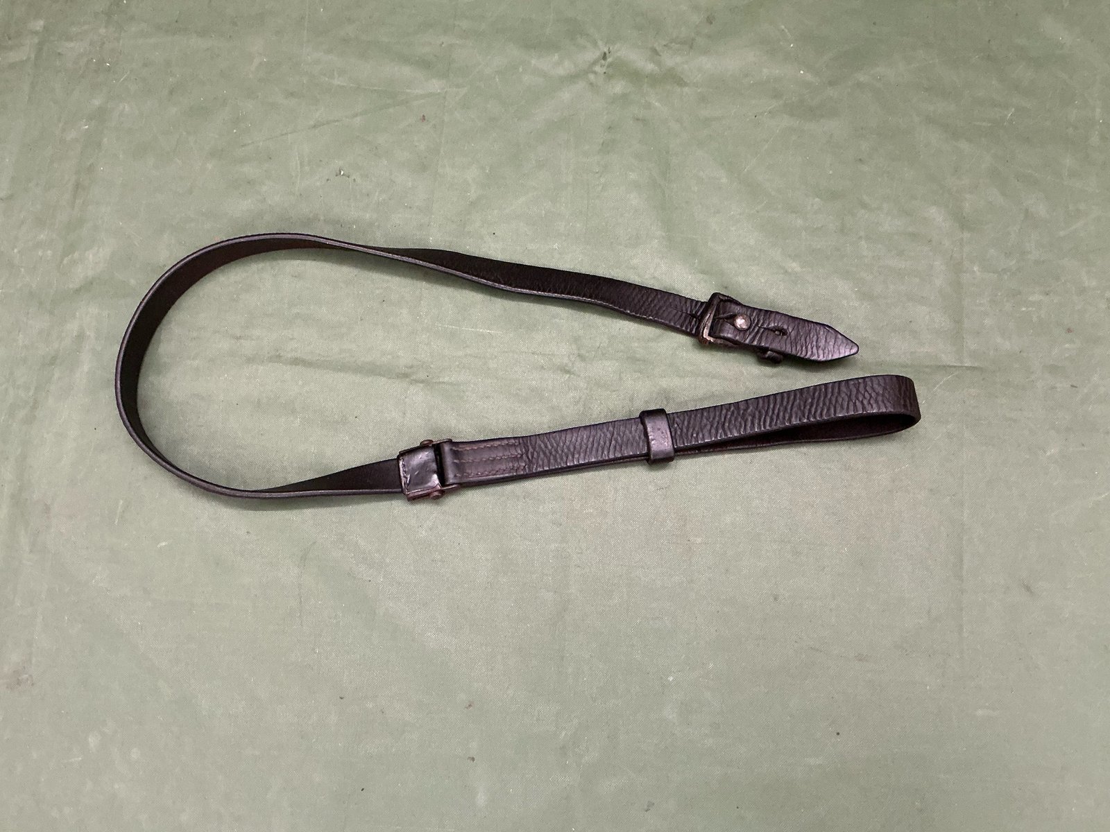 World War II original German k98 Mauser rifle sling maker marked L&F for Linden & Funke KG ,Iserlohn,has correct three holes at tab end ,complete with steel studded keeper,leather still lovely and supple.