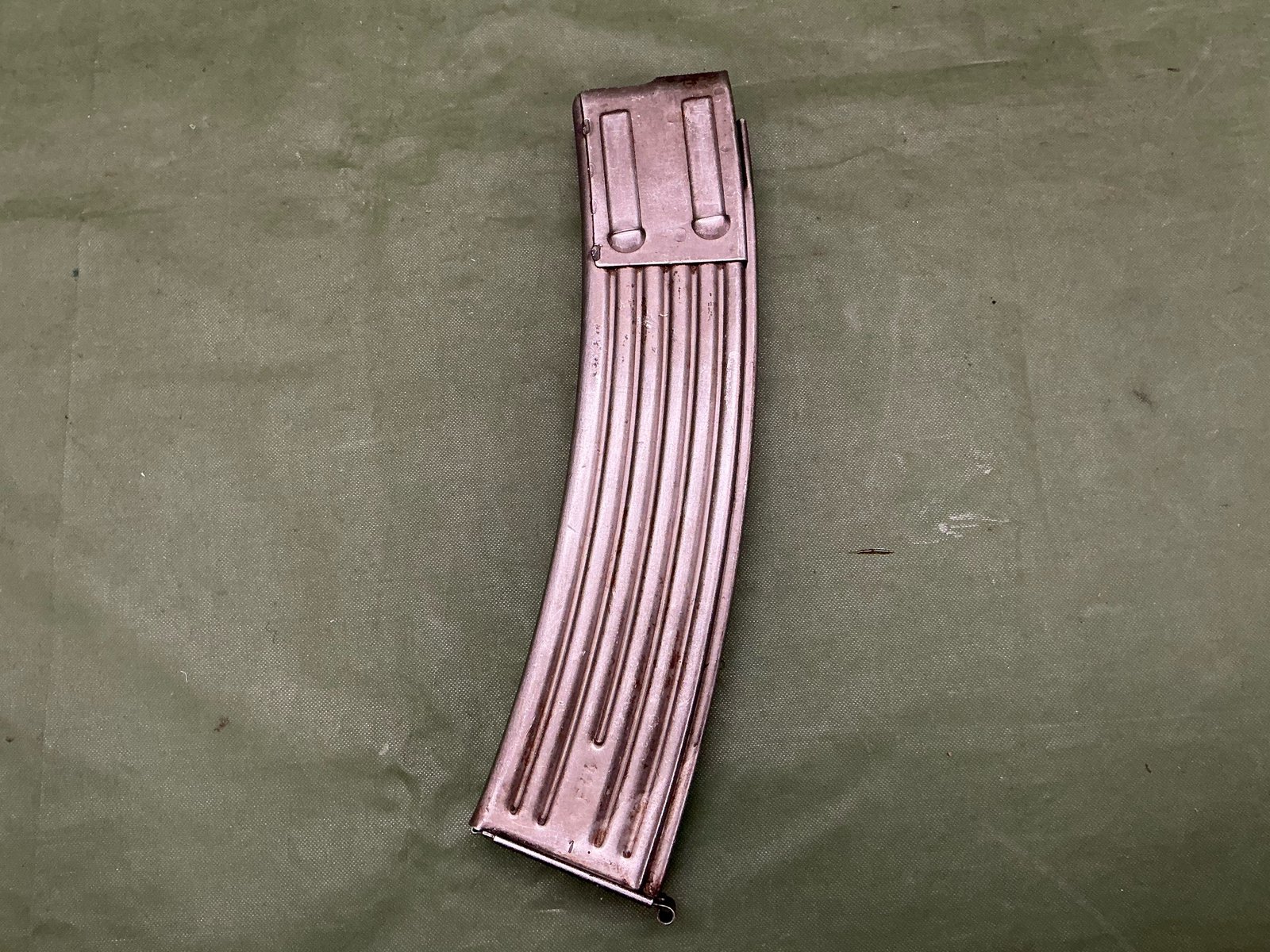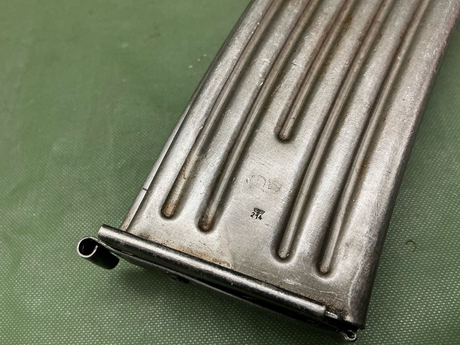 Scarce World War II German metal magazine for the MP 44 assault rifle left side of magazine stamped MP 44 right side has waffenampt stamped and maker coded ‘qnw’ nice 100% original example.