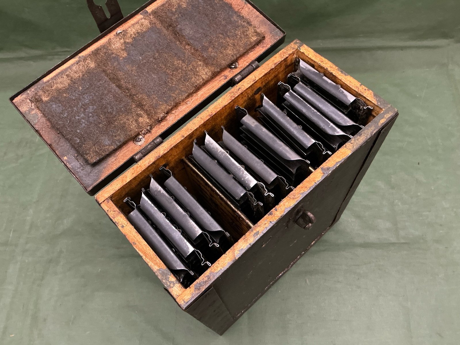 World War II Italian Breda machine gun stripper, with the correct amount of 12 clips to hold 20 rounds each,in wooden made box with leather carry handle nice overall condition.