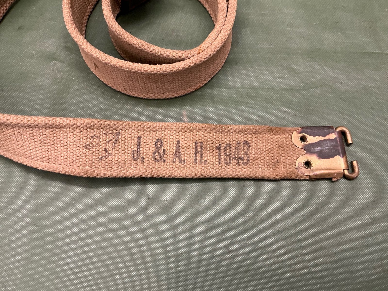 WW2 BRITISH LEE ENFIELD SLING DATED 1943 AND MAKER MARKED J & A.H’ WITH BROAD ARROW AND INSPECTION MARK WILL FIT BOTH SMLE AND NO4 RIFLES NICE TO FIND DATED EXAMPLE