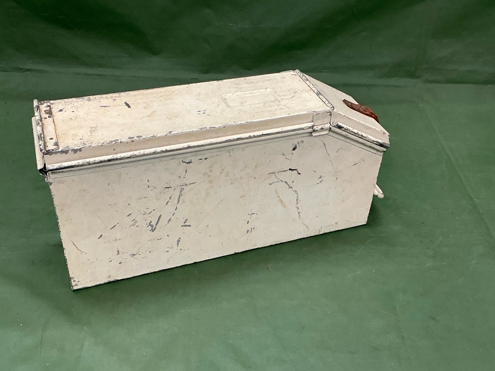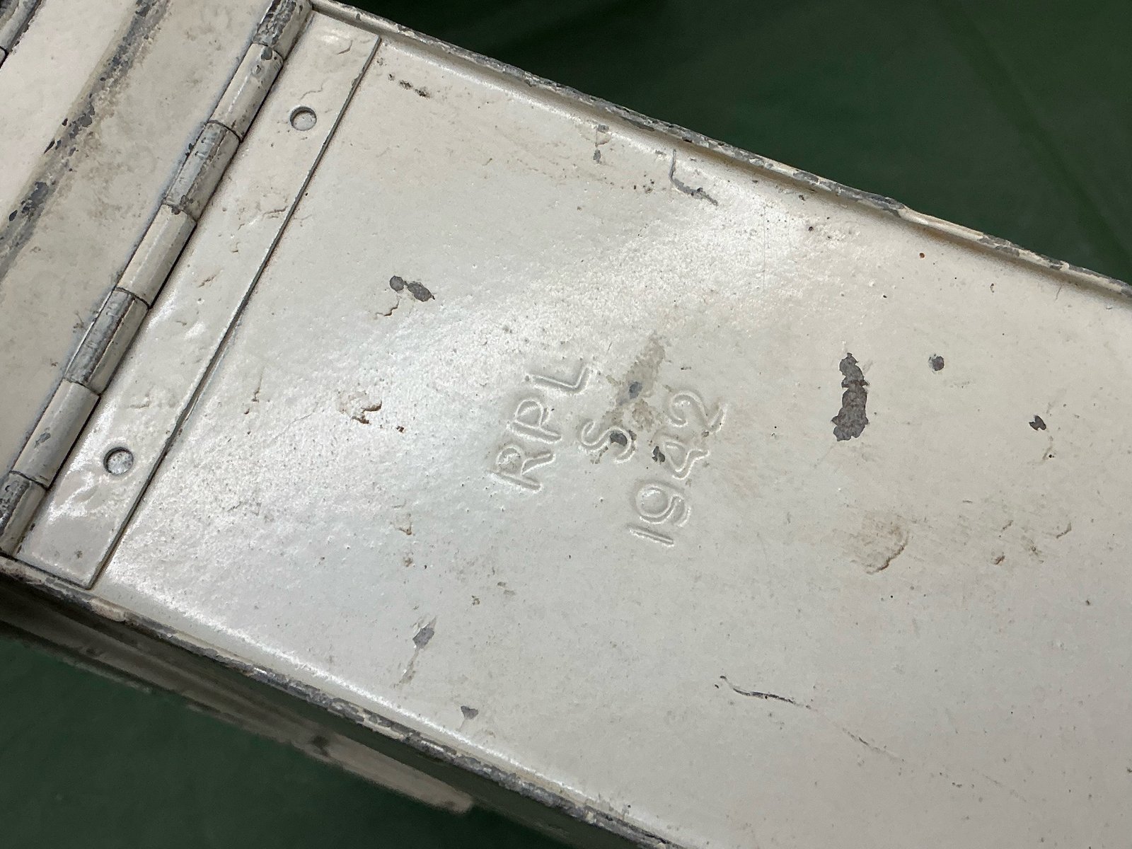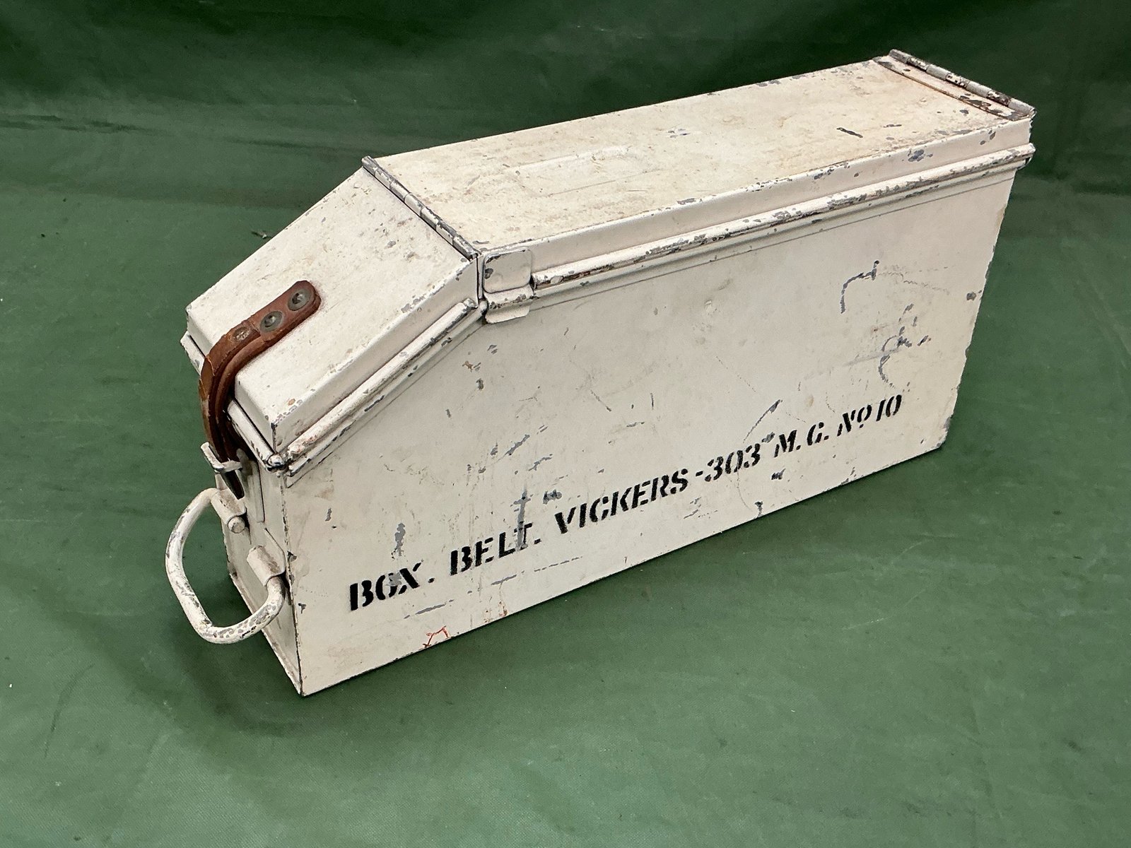 World War II metal ammunition tin for the 303 Vickers machine gun with a hinged front lid with leather tab fasteners used in armoured fighting vehicles and tanks dated 1942 with lovely paint and stencils.